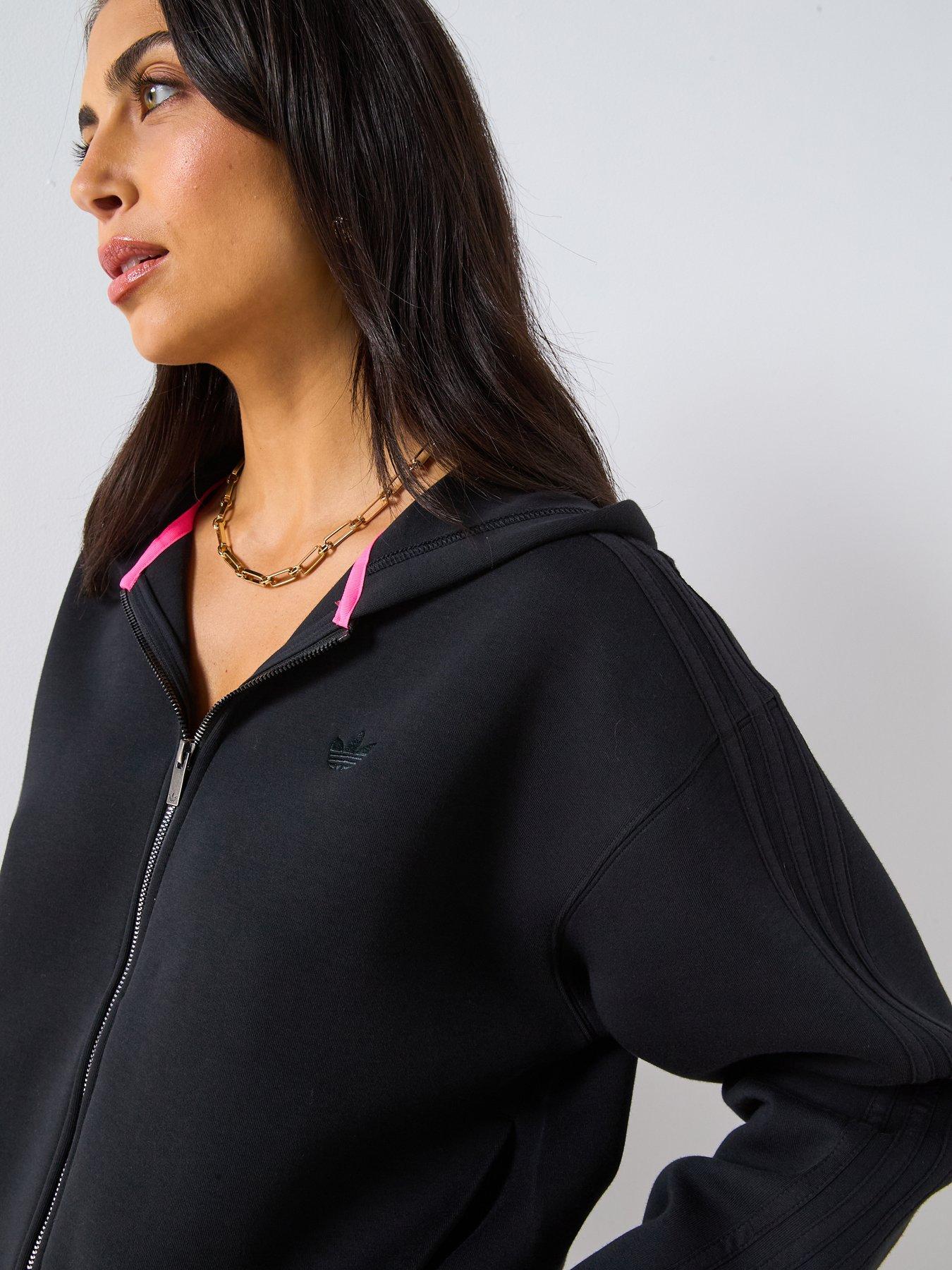 adidas Originals Women's Three Stripe Full Zip Jacket - BlackAn essential layer for everyday comfort, this adidas full-zip hoodie keeps your look casual yet put together. It's made of soft spacer fabric that's perfect for in-between weather. 3-Stripes down the sleeves and a small Trefoil on the chest give a nod to sporty heritage.