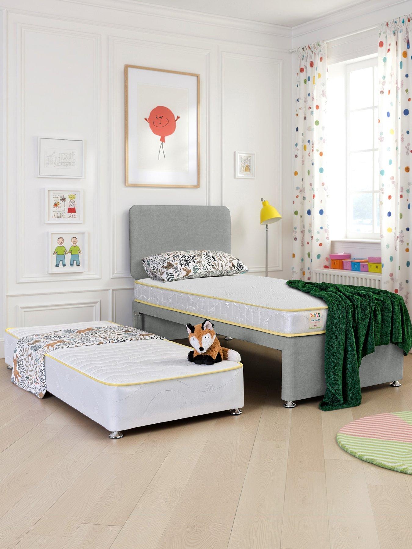 Airsprung Betty Guest Bed With Mattresses20% OFF. Offer ends 9th April. Place an order across selected home and enter code HELLOAPRIL at the checkout. This code can be used multiple times but can’t be used in conjunction with any other offer codes or promotions. Delivery and Insurance is excluded from this offer The Ultimate Sleepover SolutionBe the host with the most with the Airsprung Betty Guest Bed. This clever, space-saving set features a main bed and a hidden underbed that glides out effortlessly for sleepovers or visiting family. Designed with our signature Ultimate Freshness technology and charming bee-themed details, it is a practical, stylish, and comfortable addition to any childs bedroom or spare room. Instant Extra Sleeping Space: Includes a main bed and a matching 75x175cm underbed-perfect for making the most of smaller rooms. Ultimate Freshness Technology: Both mattresses feature a soft-touch knit panel which is anti-fungal, anti-bacterial, and anti-dust mite to stay hygienic and fresh night after night. Breathable & Foam-Free: Packed with Ecopoly fibres, offering a supportive, airy sleep environment without the use of foam. Stylish Yellow Accents: Finished with a vibrant yellow tape edge and a playful bee-design damask border that kids love. Complete Bedroom Look: Comes with a matching 56cm headboard in durable fabric to create a coordinated, high-quality feel. This guest bed is designed for durability and ease. The main mattress is turnable for longevity, while the underbed features a quilted finish and smooth-gliding chrome feet for easy access. The top mattress arrives rolled, making it easy to manoeuvre through the house during setup.