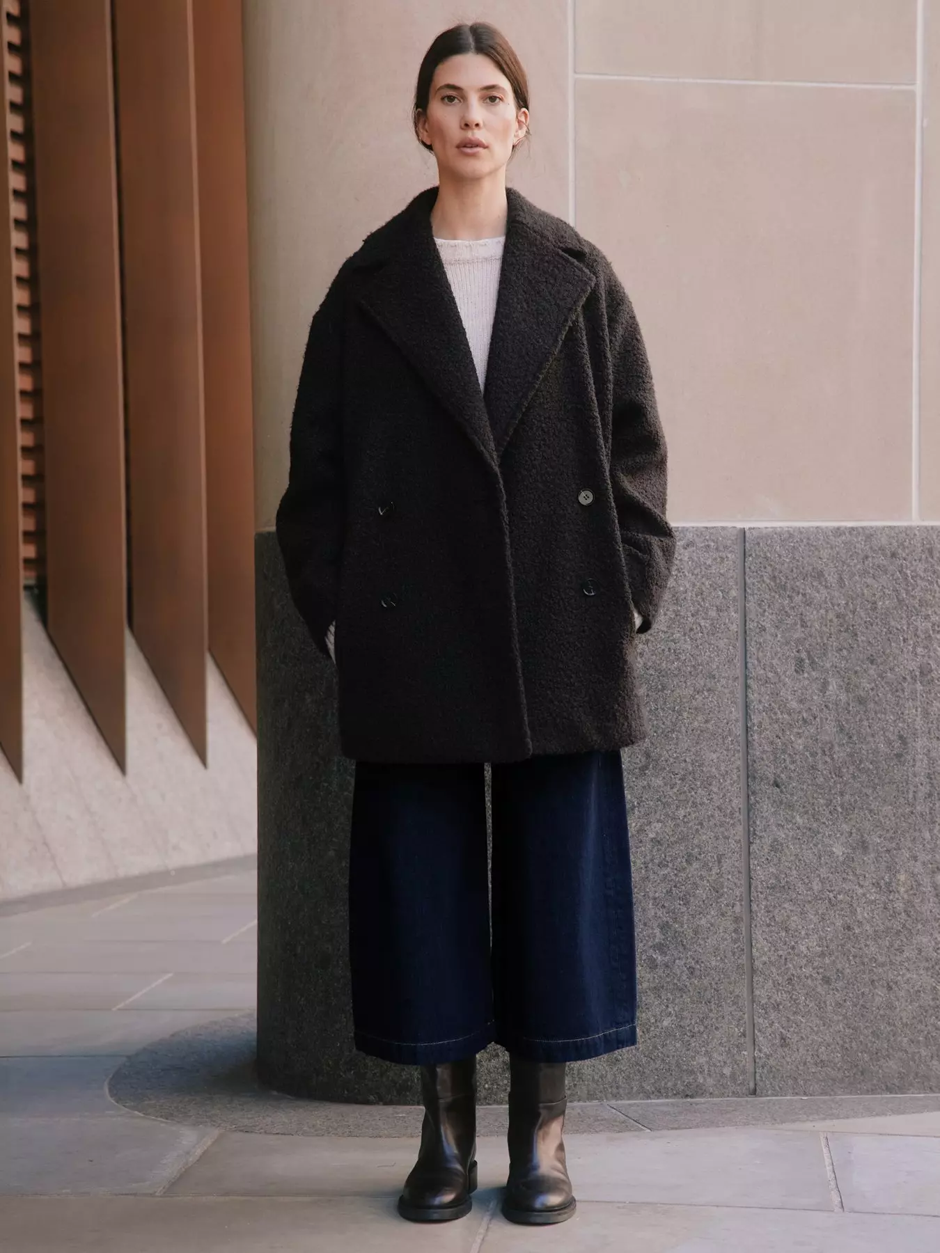 This coat in a deep chocolate shade features a plush curly fabric that feels soft and warm. Designed with a double-breasted front, classic notch lapels, and gently padded shoulders, it offers a timeless silhouette. Fully lined and oversized, it easily fits over your favourite knitwear. Practical details include two pockets and stylish horn-effect buttons, making it both functional and fashionable.- Material Content: 100% Polyester Lining: 100% Polyester