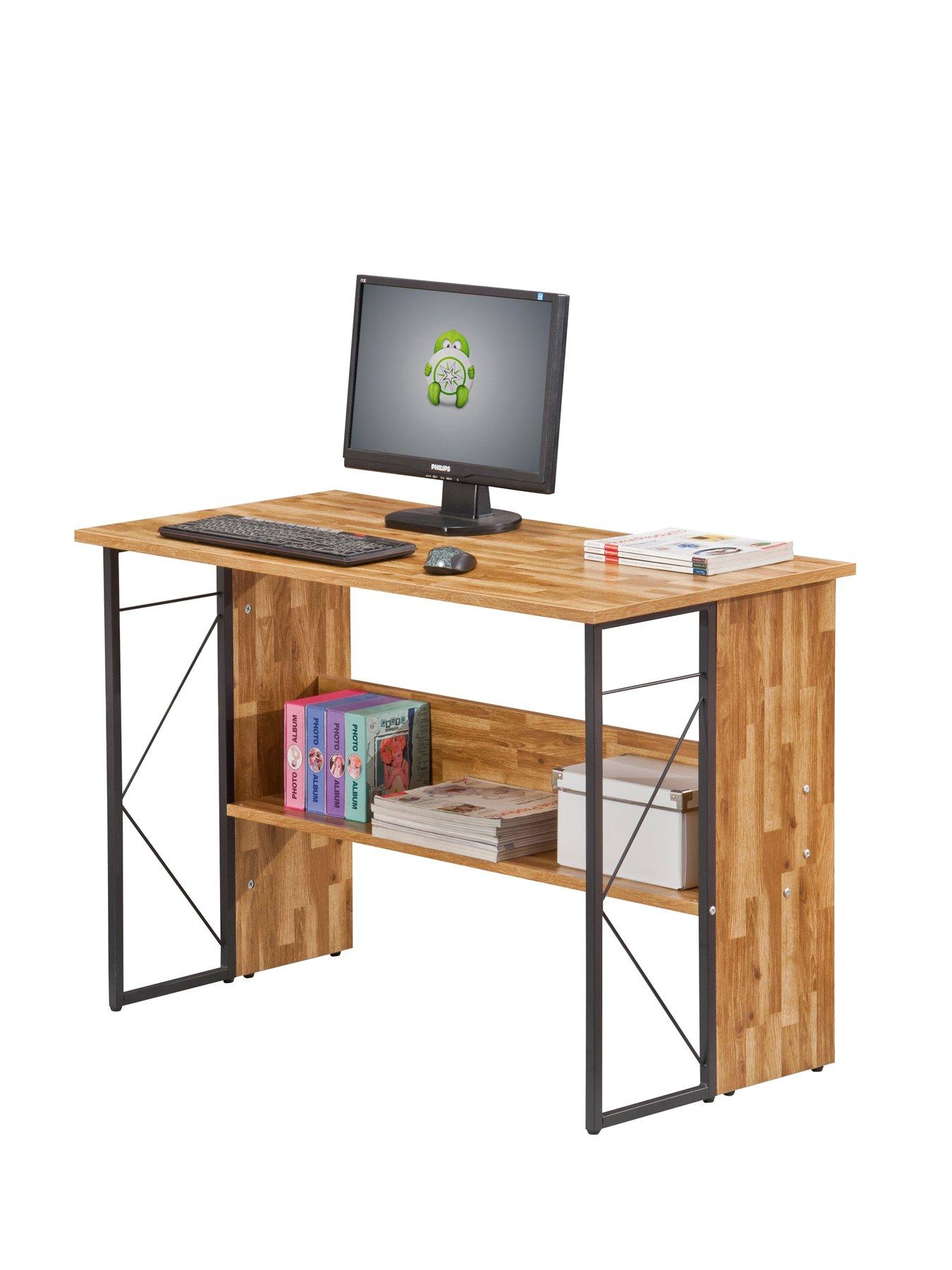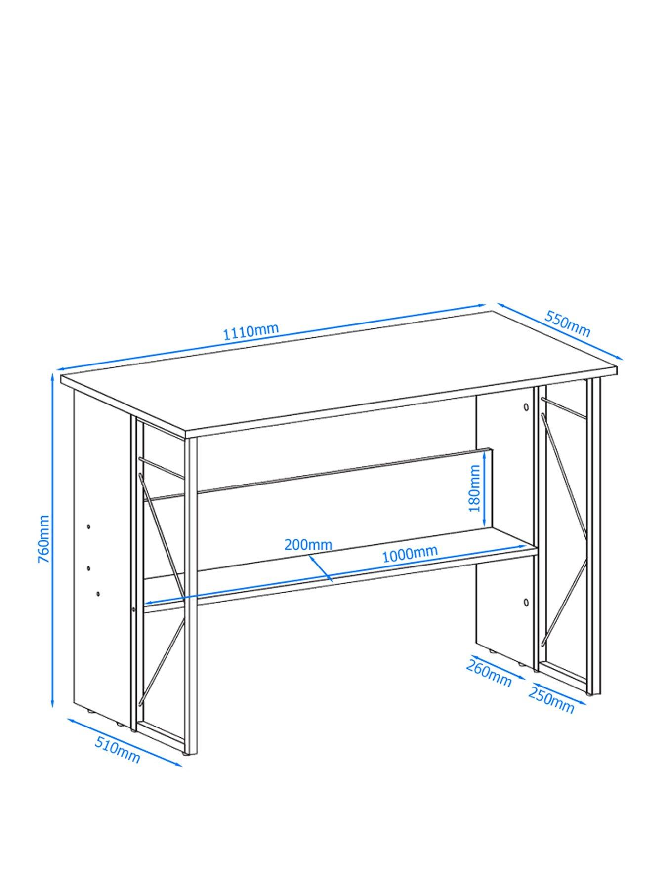 Alphason Rhodes Desk in Metal and Oak EffectThe perfect partner for when you're working from home, this Rhodes desk by Alphason features a modern mix of materials to create a truly eye-catching look.The oak-effect finish comes in a bold butcher's block design that displays a rich collection of tones. This is contrasted by the metal supports to the front which not only enhance the appearance but also strengthen the desk. A spacious desk measures 110 cm in width to provide plenty of room for your laptop, printer and other work essentials. You can keep books and files organised on the low shelf. Please remember to measure your available space before ordering. Dimensions: Height 76, Width 110, Depth 55 cm