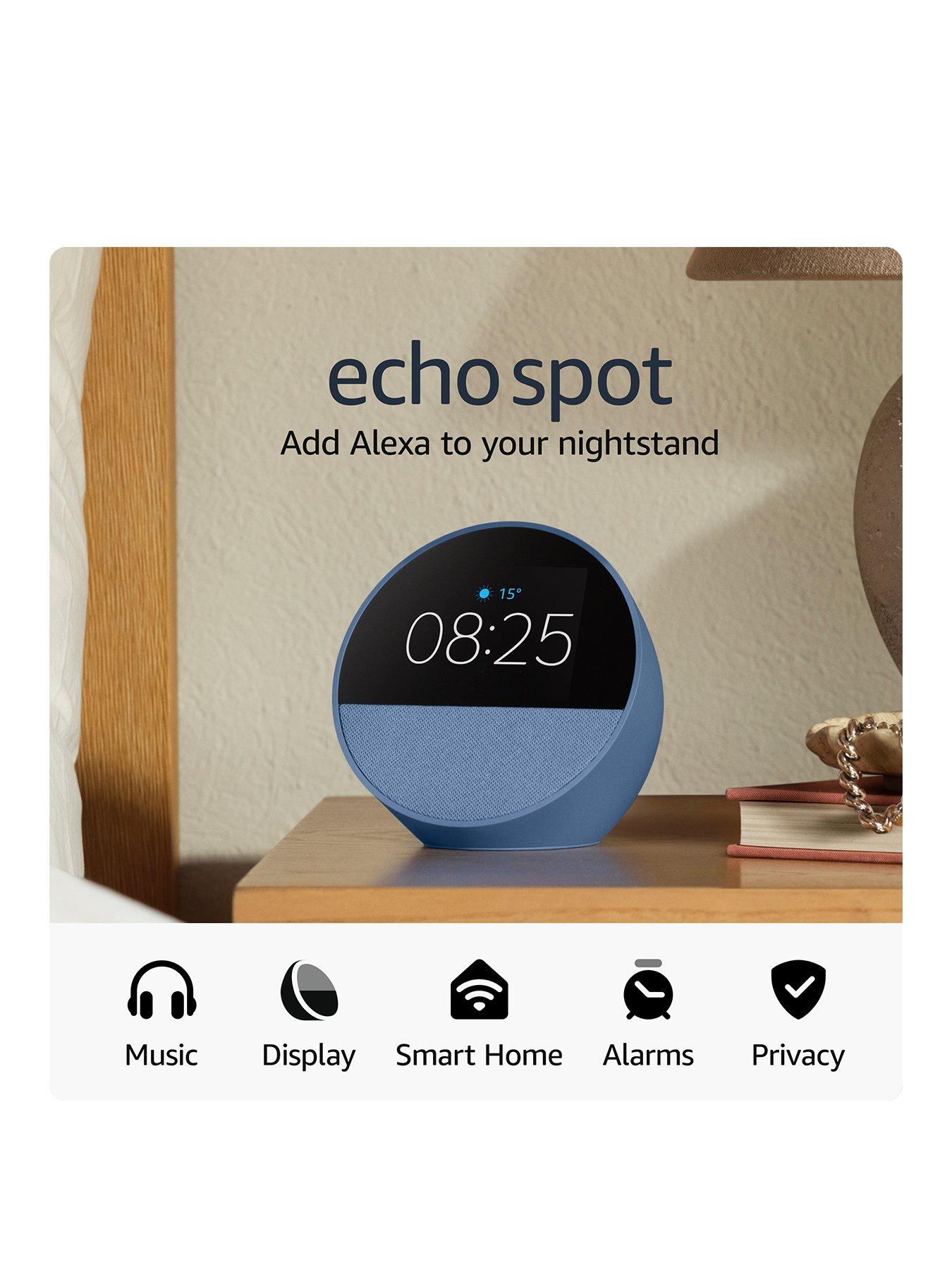 Amazon Echo Spot Alarm clock with Alexa, BlueMeet the new Echo Spot - A sleek smart alarm clock with Alexa and big vibrant sound. Ready to help you wake up, wind down and so much more.Customisable Smart clock - See time, weather and song titles at a glance, control smart home devices and more. Personalise your display with your favourite clock face and fun colours. Big vibrant sound - Enjoy rich sound with clear vocals and deep bass. Just ask Alexa to play music, podcasts and audiobooks from your favourite providers like Amazon music, Apple music, Spotify and more. See song titles and touch to control your music. Ease into the day - Set up an Alexa routine that gently wakes you with music and gradual light. Glance at the time, check reminders or ask Alexa for weather updates. Keep your home comfortable - Control compatible smart home devices. Just ask Alexa to turn on lights or touch the screen to dim. Designed to protect your privacy - Built with multiple layers of privacy protection and control, including a Microphone Off button that electronically disconnects the microphones.
