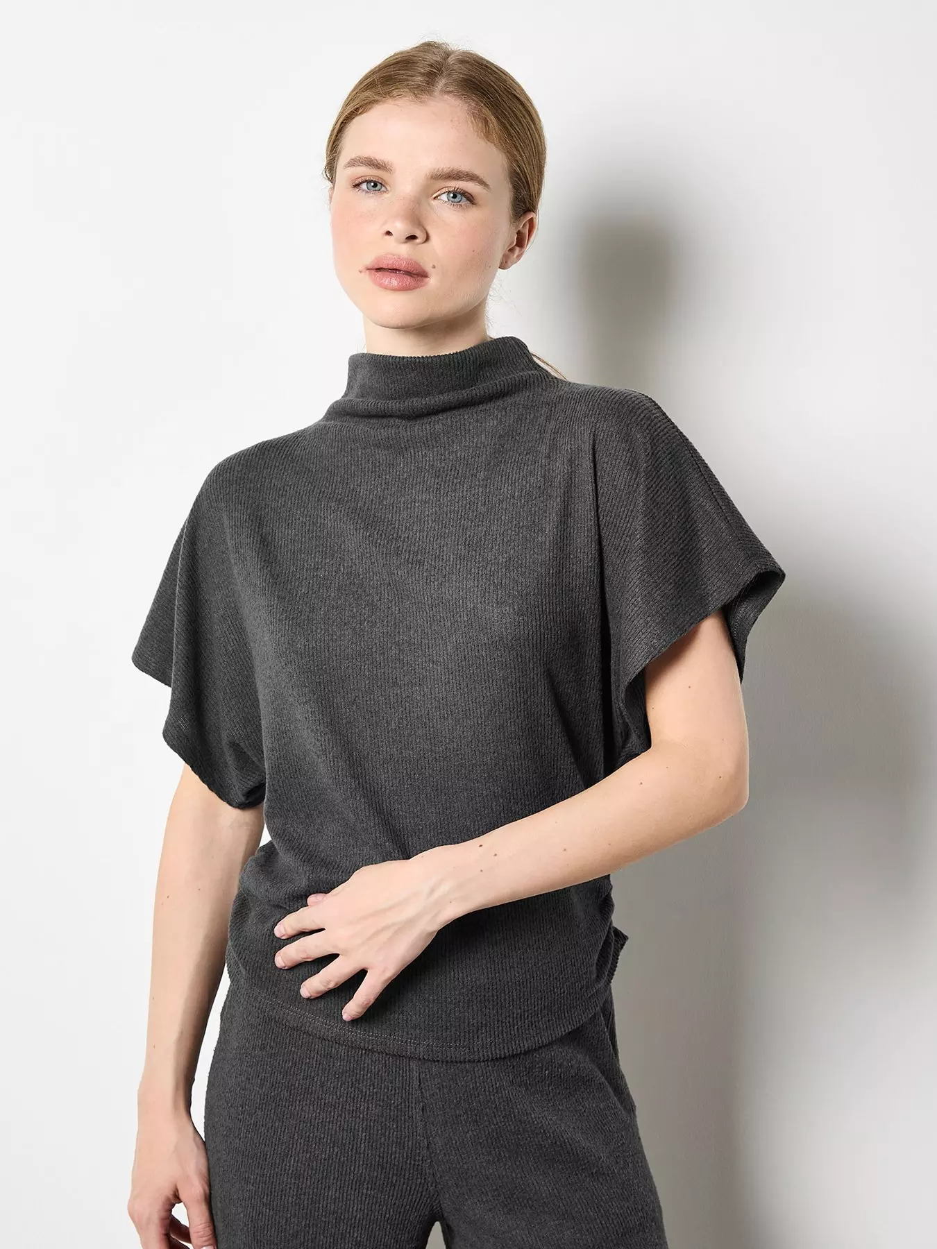 Designed for relaxed weekend wear, this top pairs a super-soft ribbed knit with a relaxed fit. It features a mock neck, short batwing sleeves, and ruched styles. Team it with the matching wide-leg trousers for a look that combines comfort and style.- Material Content: 57% Viscose, 40% Polyester, 3% Elastane