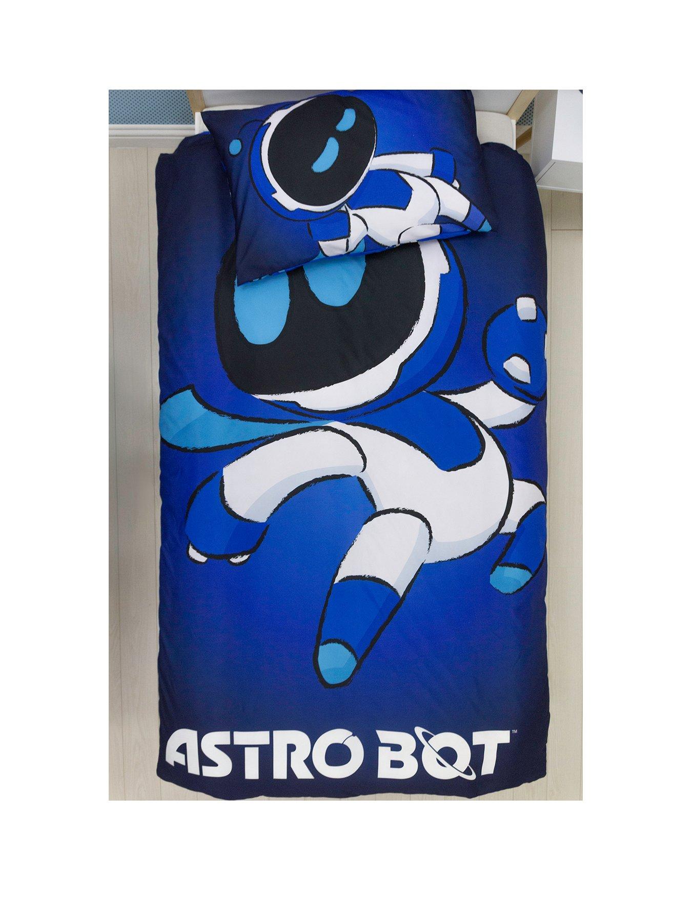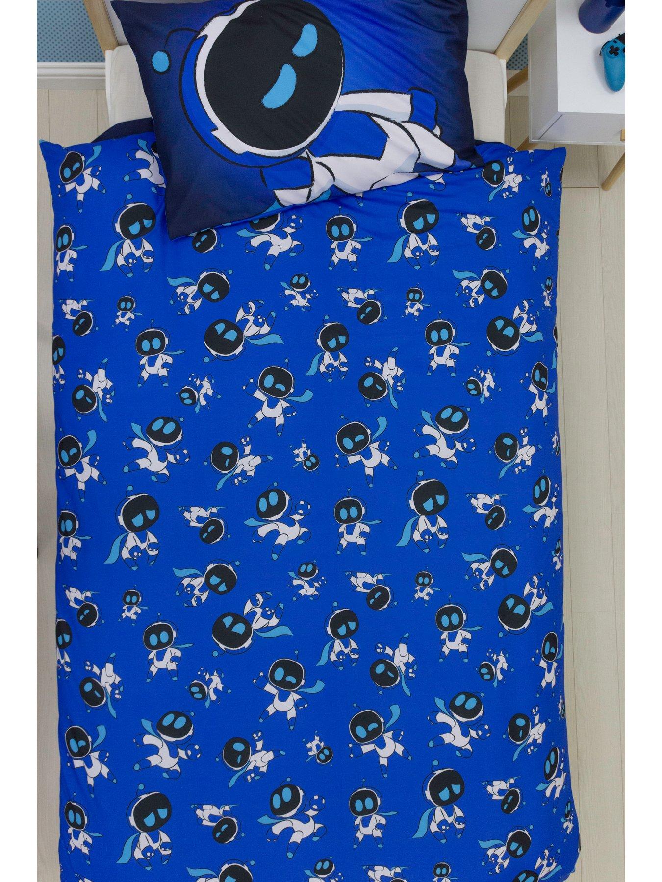 Astrobot Space Panel Duvet- SingleGreat for the young gamer in your life, this single duvet cover and pillowcase bedding set features a reversible design, so you can flip the quilt over and freshen up your childs room. Officially licensed by Sony PlayStation, the top side of the duvet cover features a large print of PlayStation gaming mascot Astrobot on a diffused blue background with the ‘Astrobot logo in white. The matching side of the pillowcase features Astrobot relaxing on the same blue background. The reverse side features a repeating pattern of Astrobot in multiple different poses on a blue background, and is matched across one side of the pillowcase. The bedding is printed to a high standard. Made from brushed microfibre, this quilt cover and pillowcase bedding set is super soft and comfortable, and easy to wash with no need to iron-out creases. The bedding features popper closing so its easy to remove and wash, and is machine washable, and tumble dryer safe at a low temperature. Designed for single beds, the duvet cover measures 135 x 200cm, and the pillowcase is a standard UK size of 74 x 48cm