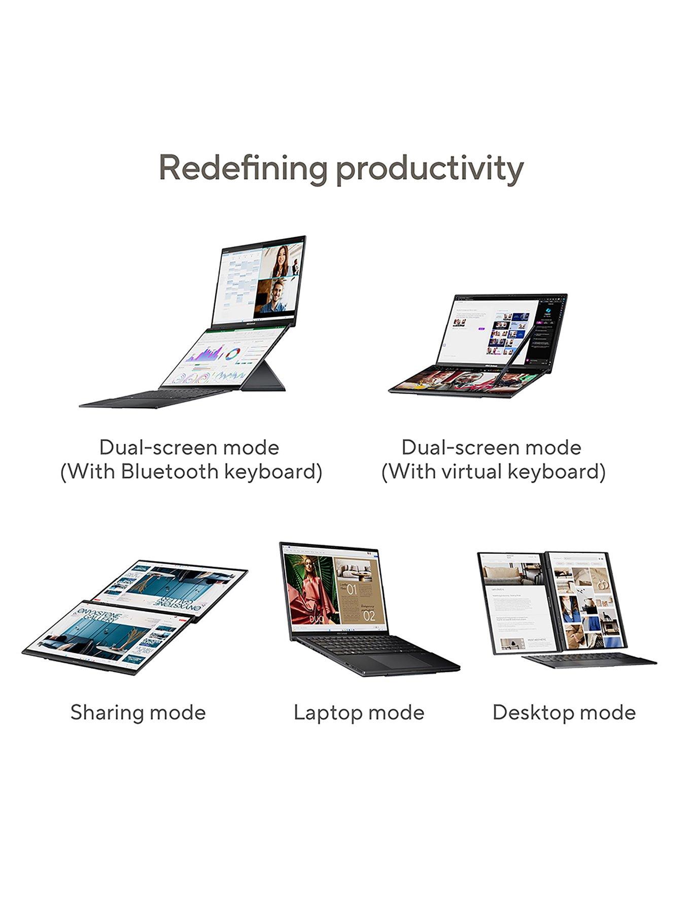 ASUS Zenbook DUO is a revolutionary dual-screen laptop, with two full-size OLED touchscreens, detachable full-size keyboard and built-in kickstand, - expertly combining multitasking versatility with superb mobility. With dual 14-inch 3K OLED 120 Hz displays, you can instantly expand your workspace to up to 19.8 inches. Outstanding performance is assured with up to an AI-powered Intel Core Ultra 9 processor and 32 GB LPDDR5x memory, plus 2 TB PCIe 4.0 SSD. Paired with dedicated smart software, intuitive gesture control and an enhanced-lifespan 75 Wh battery, the easy-to-use Zenbook DUO maximizes productivity, with zero fuss. Come on - Let's DUO it. * This product is supplied with a charging device. * The required output of a suitable charging device is 65.0W minimum and 100.0W maximum. * This product supports PD fast charging (harmonised fast charging)