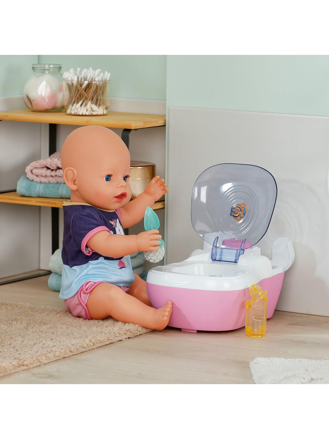Baby Born Doll Poo-Poo ToiletWith BABY born, even using the toilet is fun for your little one! Sit their doll on the toilet to hear splashing noises, stay seated to hear the fun toilet song.Use with your BABY born Emma to really wee! Press her tummy button to release the water and the magic water reveal feature will show the results in the toilet, just like real life. With the handy cleaning accessories, your little one can even clean up after. Also includes fun sticker sheet for your little tot to decorate the potty exactly as they wish! Suitable for 36cm and 43cm dolls. Suitable for children aged 3+ Doll not included.