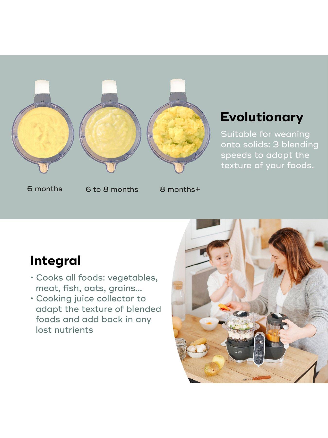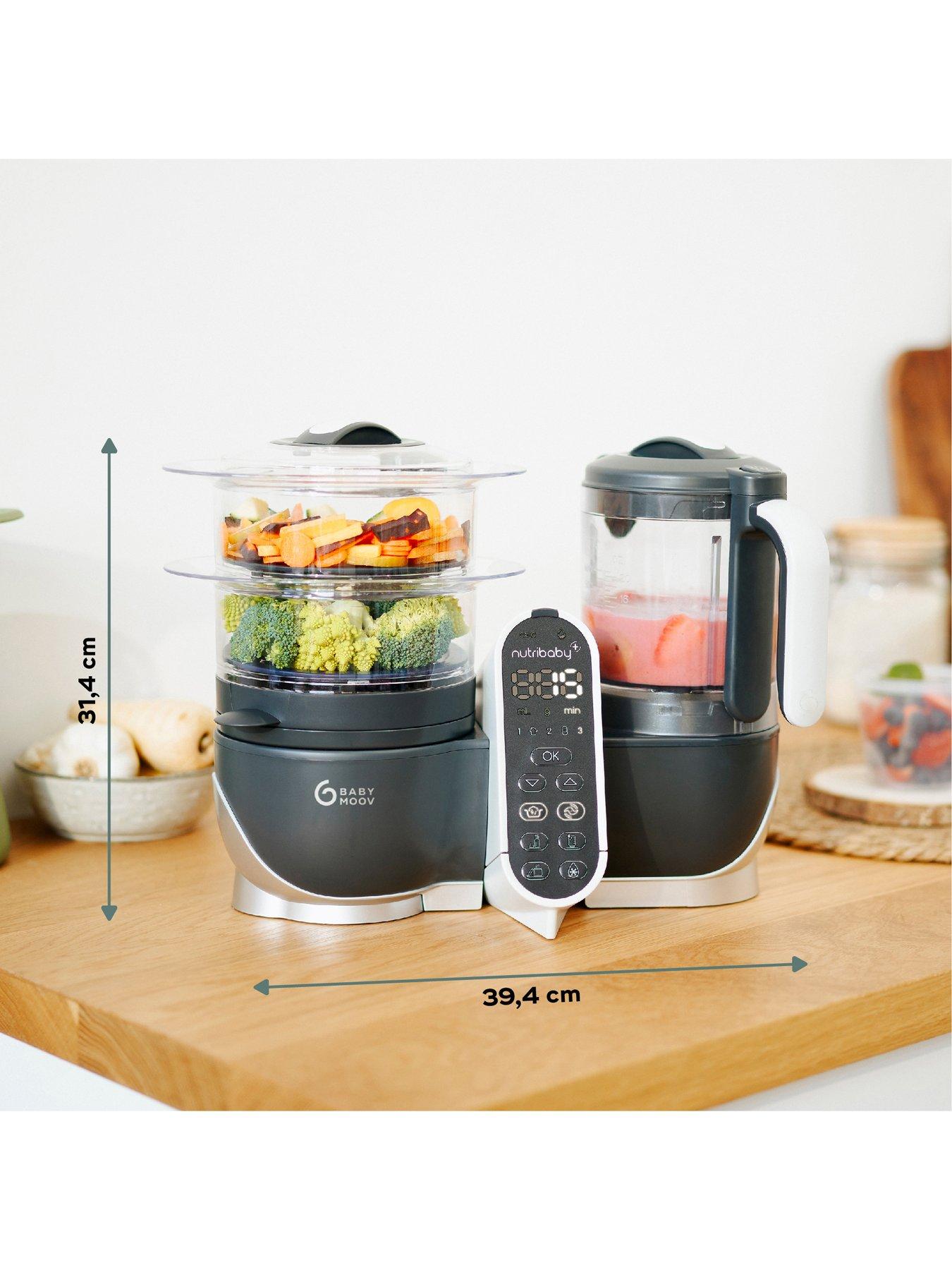 Nutribaby(+) Baby Food Processor - quick, easy and nutritious meal prep for baby and the whole family.Outstanding VersatilityThe award-winning Nutribaby(+) is the only food prep solution on the market offering 5-in-1 cooking functions, including a large capacity steamer and blender which double up to sterilise baby bottles, reheat and defrost prepared meals and more. Nutribaby(+) also features the cooking vessel in the base of the steamer where you can cook pulses, oats, pasta and other grains too. The 3 blending speeds allow you to adjust textures for soups, purées or smoothies. No need for a multitude of appliances, it does it all! Looking After Your Baby Healthy meals can be prepped easily right from scratch,. giving parents the ability to know exactly what is going into their food in place of ready made food jars and meals. Nutribaby(+) supports the combination of spoon-led and baby-led weaning with the steamer and blender functions. Annabel Karmel Approved We're proud to work closely with Nutritionists and industry experts who test our baby feeding products for their approval - including expert baby food author Anabel Karmel. PRE-BIRTH - Steam cook nutritious meals for during pregnancy POST BIRTH - Warm up and sterilise baby bottles safely and easily thanks to the large capacity steam unit! BABY'S FIRST FLAVOURS - From 4 months onwards, you can begin to introduce new flavours and textures. Gently steam veg for baby-led weaning or blend into purees FAMILY MEAL TIMES - Easily prepare a whole family meal with 10 pre-programmed functions. LIFETIME WARRANTY - This product comes with a Babymoov lifetime warranty and unwavering support. Register your product for Lifetime warranty in minutes at babymoov.co.uk - you'll just need your proof of purchase.