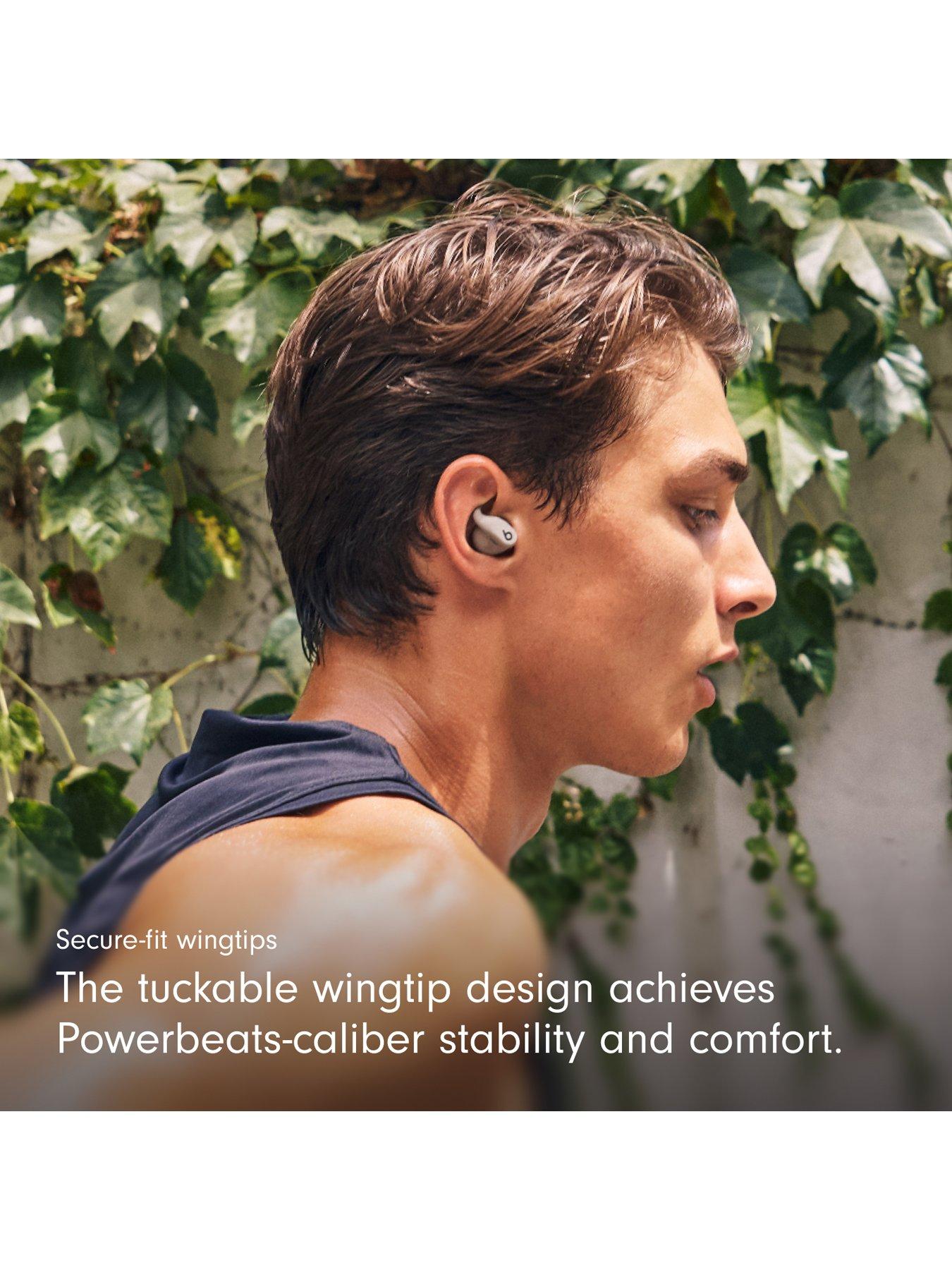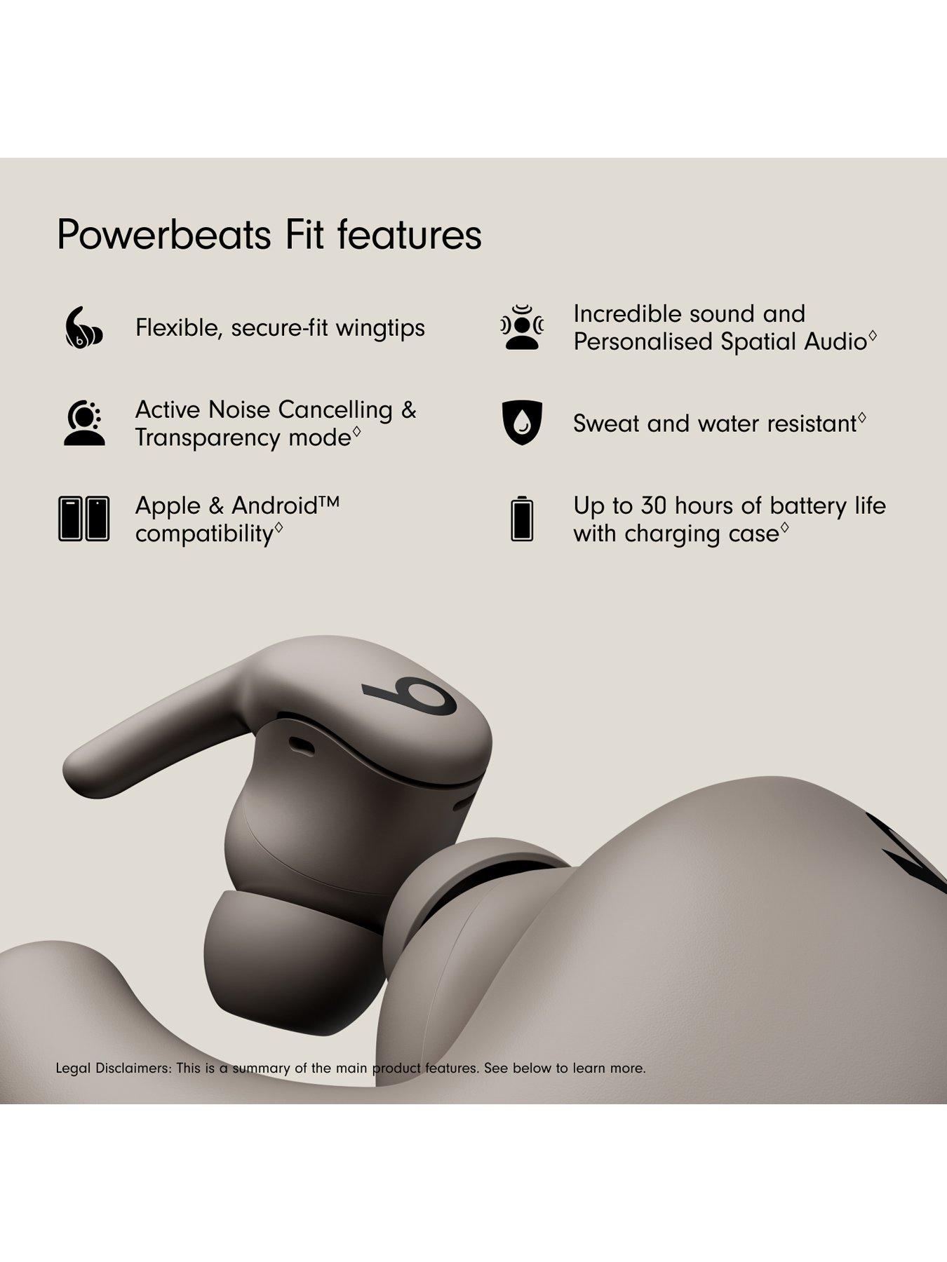 Wireless Noise-Cancelling Workout Earbuds with Sweat and Water Resistance and Comfortable, Secure-Fit Wing Tips for Ultimate StabilityBuilt for ultimate stability and comfort, Powerbeats Fit is a true wireless earbud made for everything from workouts to work calls, with universal secure-fit wing tips that gently tuck in your ear to stay in place as you move.Designed to fit so comfortably and securely that you don’t even have to think about your buds, the flexible wing tip is the result of years of research and development, all to deliver a true in-ear bud with the exceptional stability you expect from Powerbeats. The ergonomic earbud shape is designed around a custom acoustic platform and proprietary drivers that deliver powerful, balanced sound across the full audio spectrum for an incredible listening experience. For absolute focus, advanced Active Noise Cancelling (ANC) blocks external sounds, while Transparency mode lets you hear what’s going on around you.1 Powerbeats Fit is sweat and water resistant with an IPX4 rating2, 3, so these workout earbuds can handle intense training even in the rain, snow or heat. Powerbeats Fit delivers up to 30 hours of battery power with the charging case, with each bud delivering up to 7 hours of playback per charge.4 Thanks to Fast Fuel, a quick 5-minute charge will give you up to an hour of playback when battery is low.5 The redesigned charging case is 17% smaller than its predecessor. The case is also sweat and water resistant with an IPX4 rating.2, 3 Powerbeats Fit is compatible with both Apple and Android™ devices.6 What’s in the box: