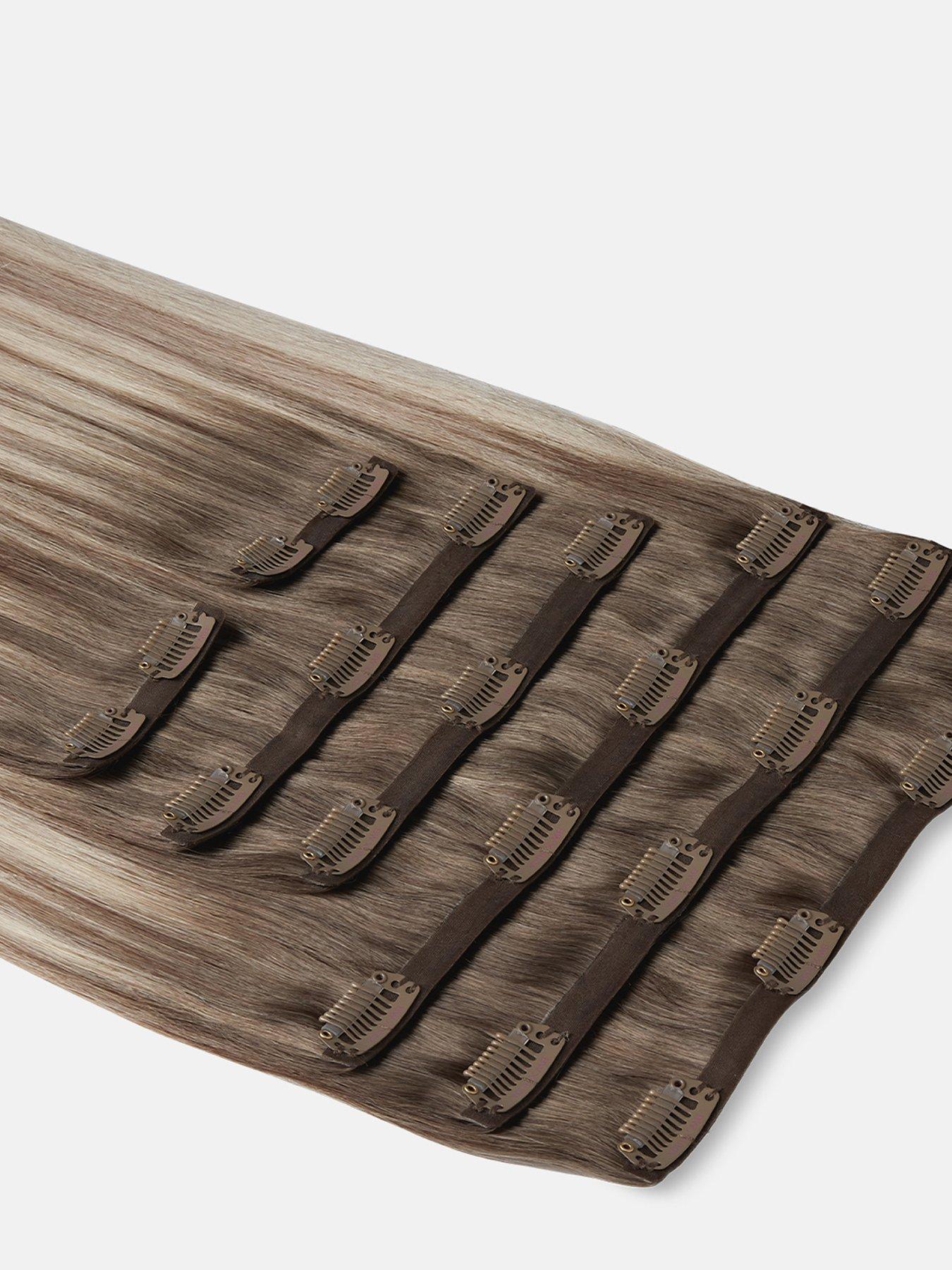 Beauty Works x Huda BARELY THERE Clip ins 18" Sunset BoulevardExperience the most natural-looking clip-in extensions with Beauty Works x Huda. This full 7-piece clip-in set of 100% Remy human hair, provides maximum coverage, blending effortlessly with your hair for a flawless finish.These lightweight extensions mimic the scalp for an undetectable, barely-there look. Add volume, fullness, or colour without the weight, perfect for concealing thinning areas or boosting your hair's natural thickness. The extensions allow you to experiment with colour, whether you're adding highlights, lowlights, or a contrasting hue, all without the commitment of dyes. These luxury hair enhancements deliver an instant transformation with easy at-home installation and removal in minutes. Experience a 'push-up effect' that mimics natural hair, with colour-coded clips and a silicone layer to protect your hair from damage. Apply the Barely There Full Set to clean, dry hair for best results. This set is designed to offer full coverage and natural volume throughout the hairline for all hair types. How to Apply: Starting at the nape of the neck, section the hair with a tail comb and backcomb slightly if needed for better grip. Snap the first 4-clip weft securely at the root. Apply the next two 4-clip wefts, working your way up the head in even horizontal sections. Use the 3-clip wefts to add balance and volume to the sides, applying above the ears on each side of the head. Apply the 2-clip wefts near the temples to add a face frame and blend the extensions seamlessly with your natural hair. Top Tips: Always section your hair with a tail comb and backcomb finer strands at the root before applying each weft. Spritz some Beauty Works Texturizing Spray or Hairspray for even stronger grip.