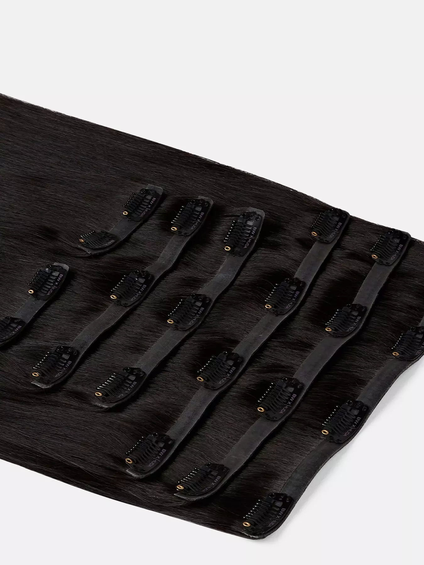 Experience the most natural-looking clip-in extensions with Beauty Works x Huda. This full 7-piece clip-in set of 100% Remy human hair, provides maximum coverage, blending effortlessly with your hair for a flawless finish.These lightweight extensions mimic the scalp for an undetectable, barely-there look. Add volume, fullness, or colour without the weight, perfect for concealing thinning areas or boosting your hair's natural thickness. The extensions allow you to experiment with colour, whether you're adding highlights, lowlights, or a contrasting hue, all without the commitment of dyes.