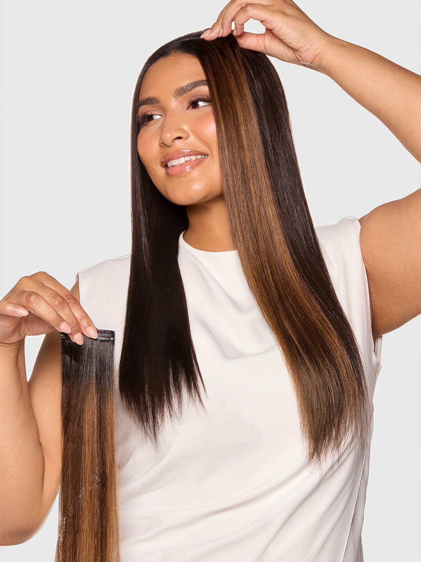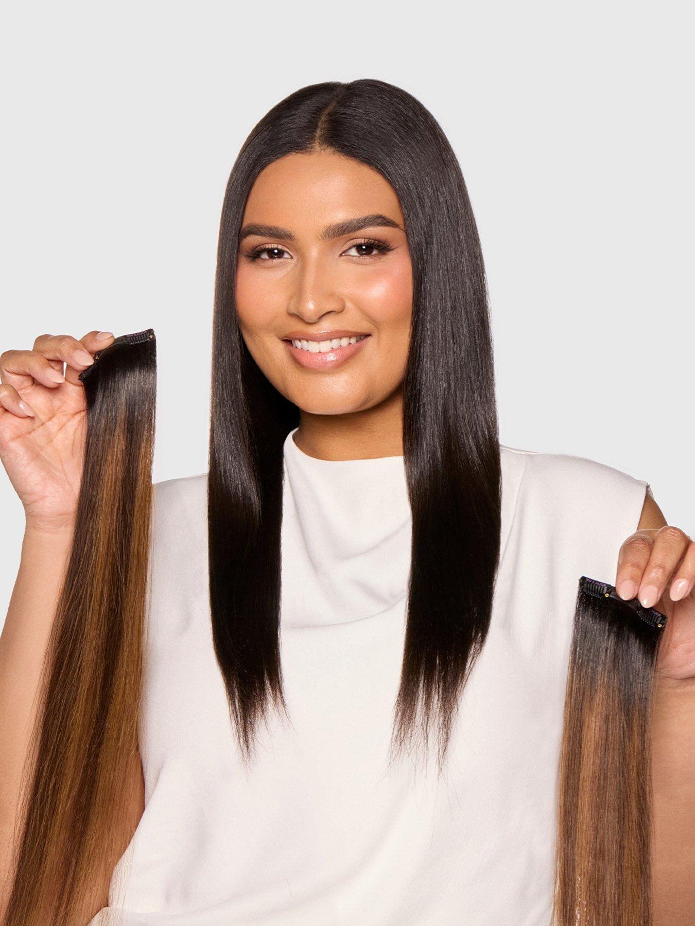 Beauty Works x Huda BARELY THERE Mix & Match Minis 20" HudaPerfect for thinning or breakage, the Mini two piece set is designed to enhance the appearance of fine hair. Ideal for adding subtle volume, face-framing highlights, or customised blending. Especially effective around the temples where other extensions can't reach.Use it to add a pop of contrasting colour, refine finer sections or fine-tune your look with precision. Apply the Barely There Minis to clean, dry hair for subtle volume, face-framing highlights, or refined colour blending. How to Apply: Identify target areas, such as around the face or crown for soft enhancement. Section your hair based on placement, backcomb lightly at the root. Clip in the 2-clip wefts at the temples or near the parting line for a natural lift or colour touch-up. Top Tips: Always section your hair with a tail comb and backcomb finer strands at the root before applying each weft. Spritz some Beauty Works Texturizing Spray or Hairspray for even stronger grip.
