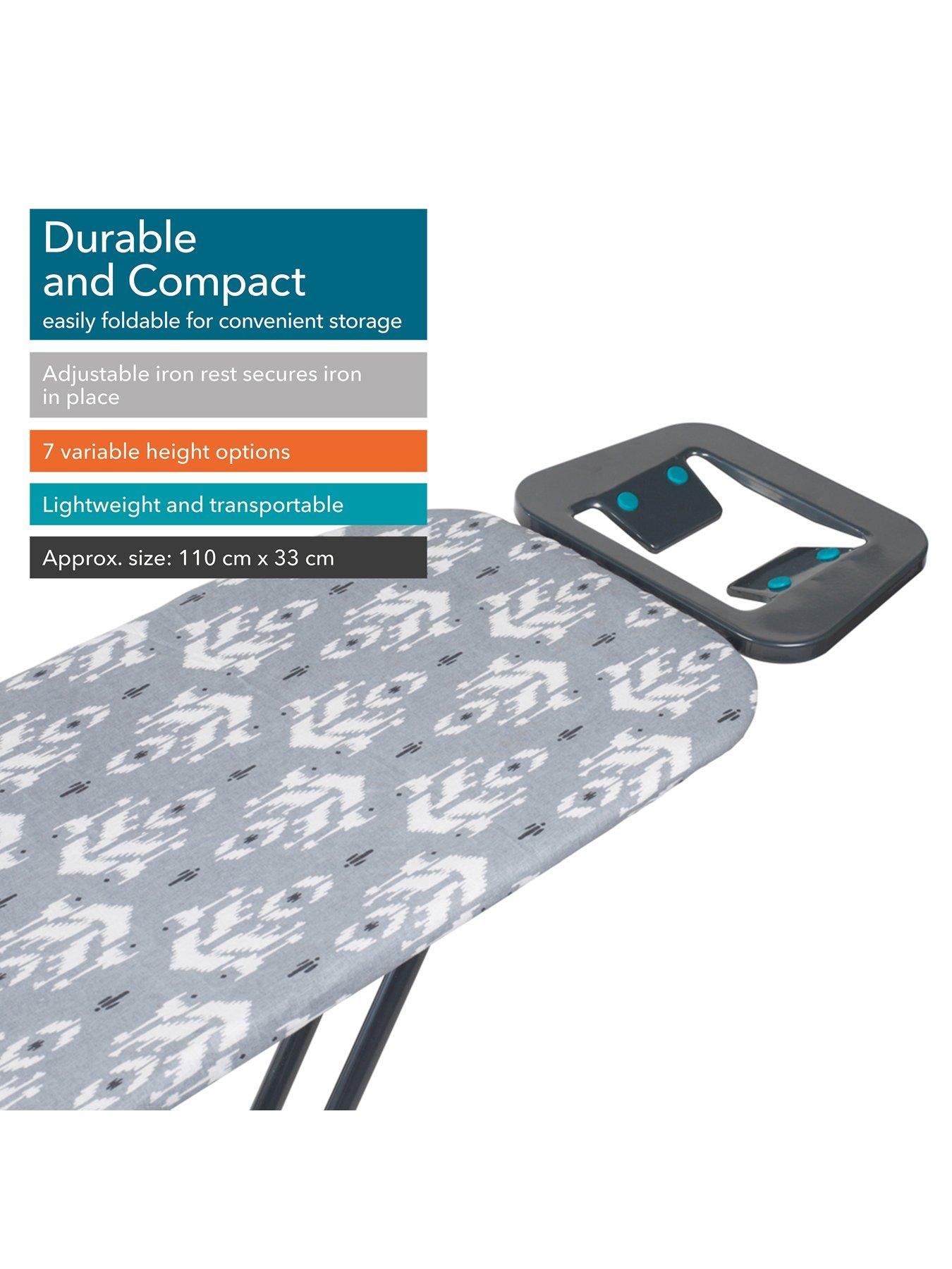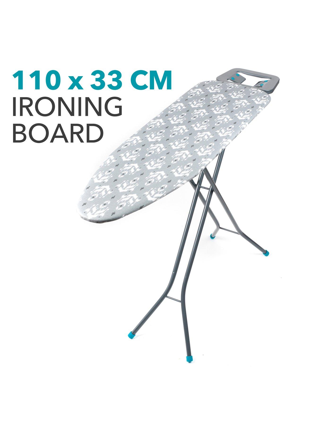 Beldray Folding Ironing BoardAchieve perfectly ironed clothes using this wonderful Beldray ironing board which allows you to position the iron at the perfect angle as you iron. The board measures 110 x 33 cm with a height of 90 cm so you can iron comfortably and conveniently, while the non-slip plastic feet provide safety. The smooth 100% cotton cover will protect your clothes while you iron and features a gorgeous grey ikat design which will look lovely in your home.