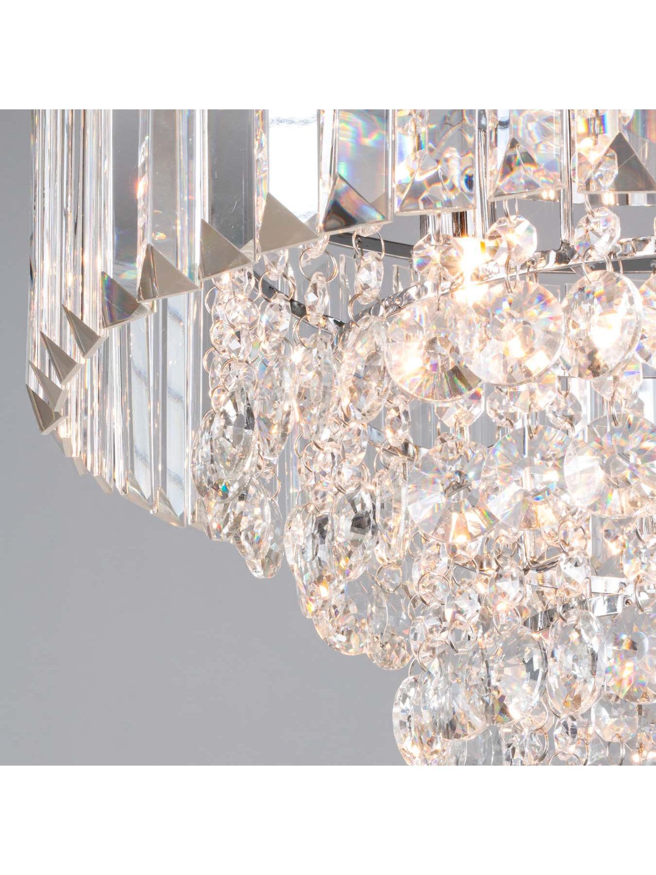 BHS Paladina Flush Ceiling Light - 40 cm diameterThis elegant Paladina flush fitting by BHS flaunts a chrome frame and tantalising tiers of clear glass droplets that are cut to catch the light and refract it around your space. Requires 3x G9 capsule 3W LED bulbs (not included). Matching lighting is available to add separately.Dimensions: Height 31, Diameter 40 cm