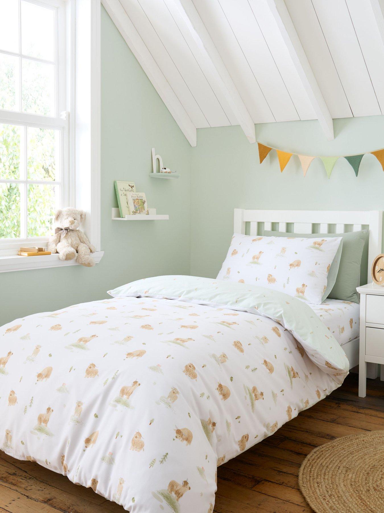 Bianca Mini Moo Duvet Set- DoubleBianca evokes a sense of well being and relaxation perfect for creating a calming retreat with timeless styling for the modern home.Take a trip to the Scottish Highlands with delightfully cute cows grazing across the green pastures. Fully reversible with a mini moo pattern, this bedlinen offers two stylish looks in one. Dream in blissful comfort under wonderfully soft cotton, a naturally breathable fibre that encourages a better night's sleep.