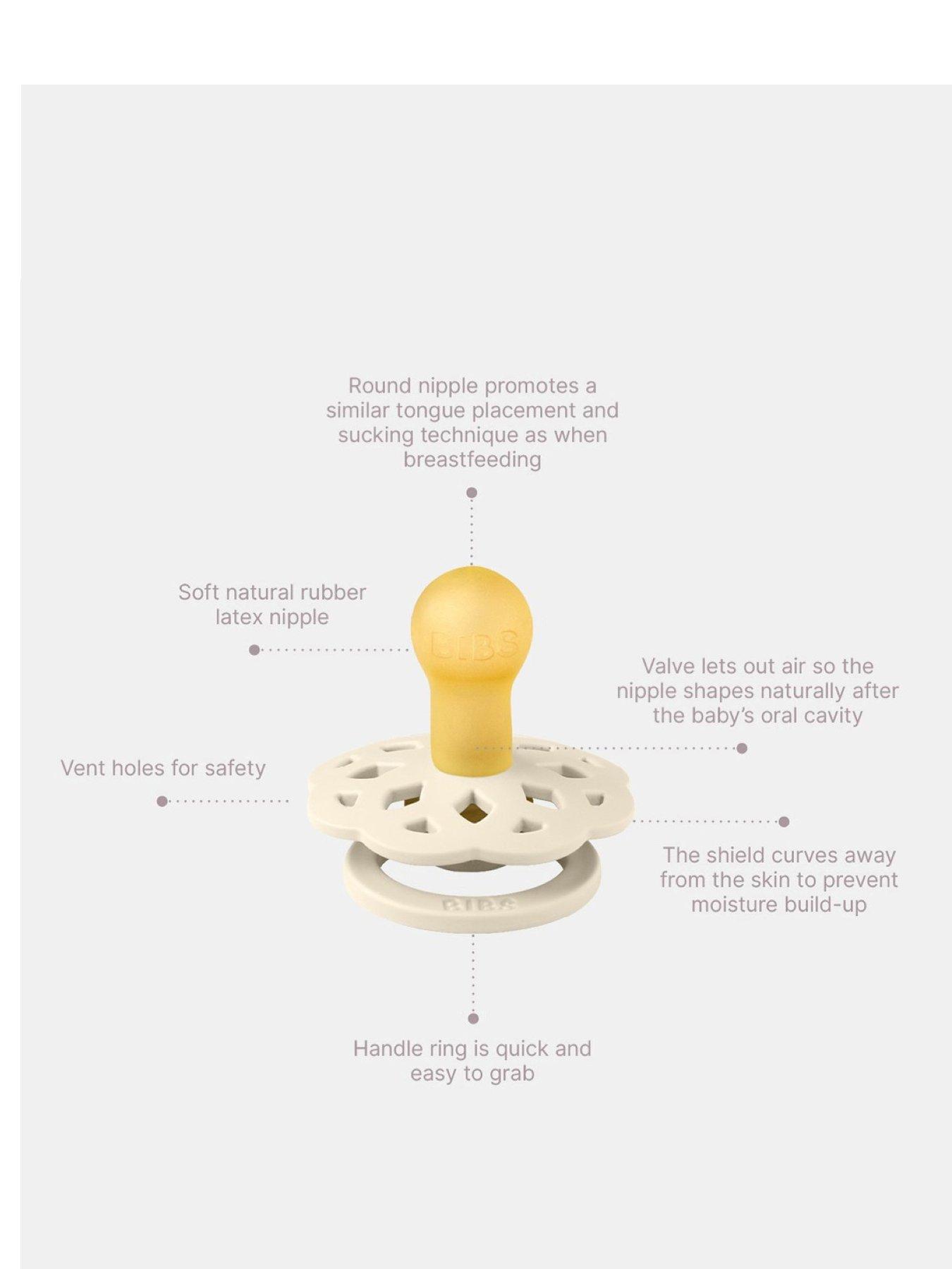 BIBS Pacifier Boheme 4 PACK Latex Size 1 - Blossom MixDitch the ordinary and embrace the extraordinary with a dummy that adds a touch of flair to your baby's favourite soothing solutions.Specifications Materials - Shield: Food-grade PP - Nipple: Natural rubber latex Sizing - It is recommended to start with a size based on your baby's age, but ultimately it's up to them to determine the best fit. As your baby grows, consider transitioning to larger sizes for comfort and safety. Use and care Before first use - Gently pull the nipple in all directions and carefully inspect it for any signs of weakness or damage - Always sterilise new dummies after removing them from the packaging Replacement - Check your baby's dummies regularly, replacing them every 4-6 weeks or at the first sign of damage or weakness. - An enlarged or sticky nipple means that it is ready to be replaced Cleaning - Sterilise natural rubber latex nipples regularly by scalding