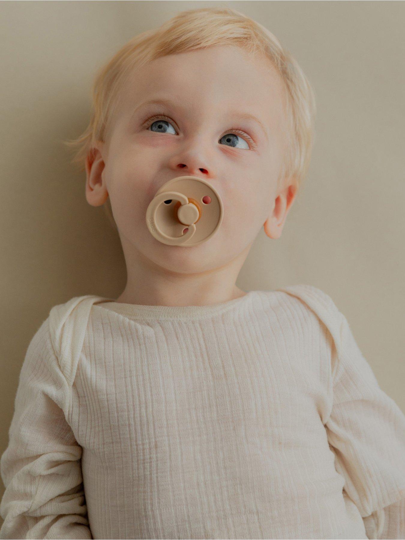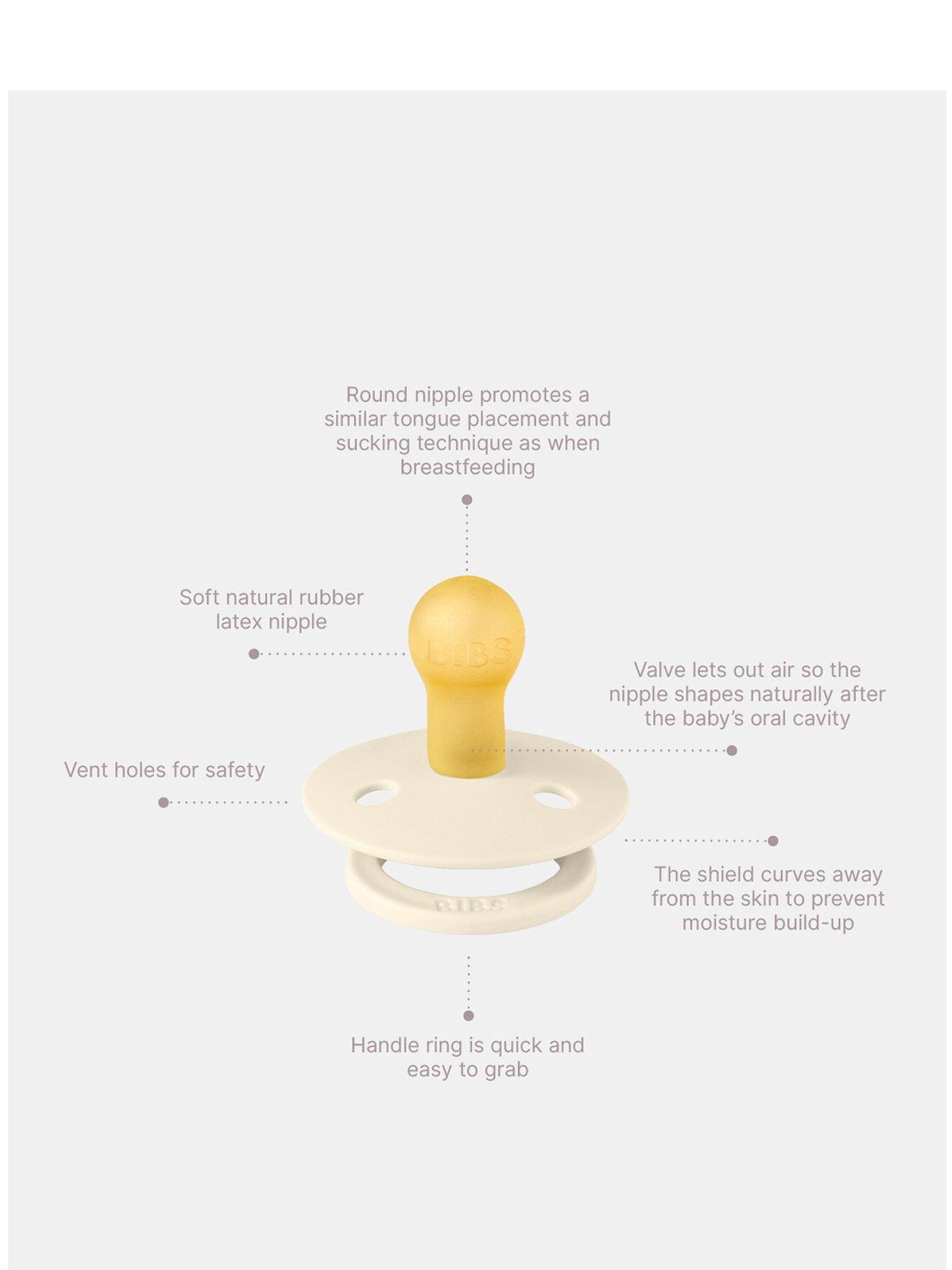 BIBS Pacifier Colour 4 PACK Latex Size 1 - Baby Blush BUNDLEMeet the iconic dummy that BIBS was built on - a timeless favourite bringing comfort and joy to babies for over 40 years. Featuring a glow-in-the-dark effect, illuminating late-night dummy hunts when time is of the essence.Specifications Materials - Shield: Food-grade PP - Nipple: Natural rubber latex Sizing - It is recommended to start with a size based on your baby's age, but ultimately it's up to them to determine the best fit. As your baby grows, consider transitioning to larger sizes for comfort and safety. Use and care Before first use - Gently pull the nipple in all directions and carefully inspect it for any signs of weakness or damage - Always sterilise new dummies after removing them from the packaging Replacement - Check your baby's dummies regularly, replacing them every 4-6 weeks or at the first sign of damage or weakness. - An enlarged or sticky nipple means that it is ready to be replaced Cleaning - Sterilise natural rubber latex nipples regularly by scalding