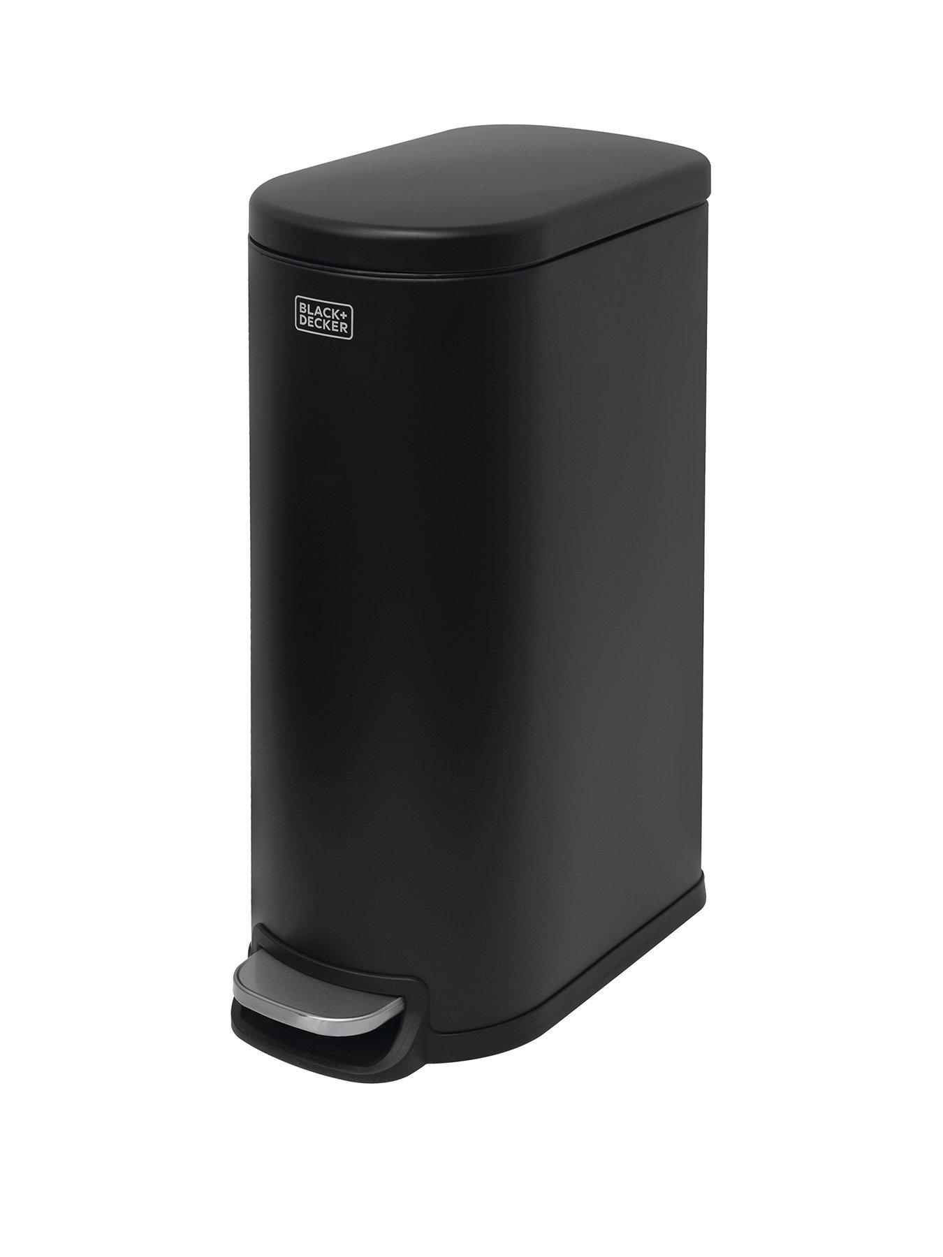 Black & Decker B+d 30l Curved Slim Line Pedal Bin - Matt BlackBLACK+DECKER's 30 Litre Slimline Pedal Bin provides a space-conscious solution for kitchen waste and recycling. It features a hygienic, simple foot pedal that opens the lid, which closes softly once the pedal is released to minimise noise. The polypropylene inner bucket, light in design, can easily be removed via the built-in handles to empty and clean the bin, and its metal exterior also features a carry handle on the back for convenient transport. The bin's narrow, curved D-Shaped profile gives it a sleek look while also allowing it to easily fit in more compact spaces compared to other similar bins, with the unit measuring 61 x 23 x 44cm. It is finished in a sleek matte black colour, making it a suitable accompaniment for most home environments.