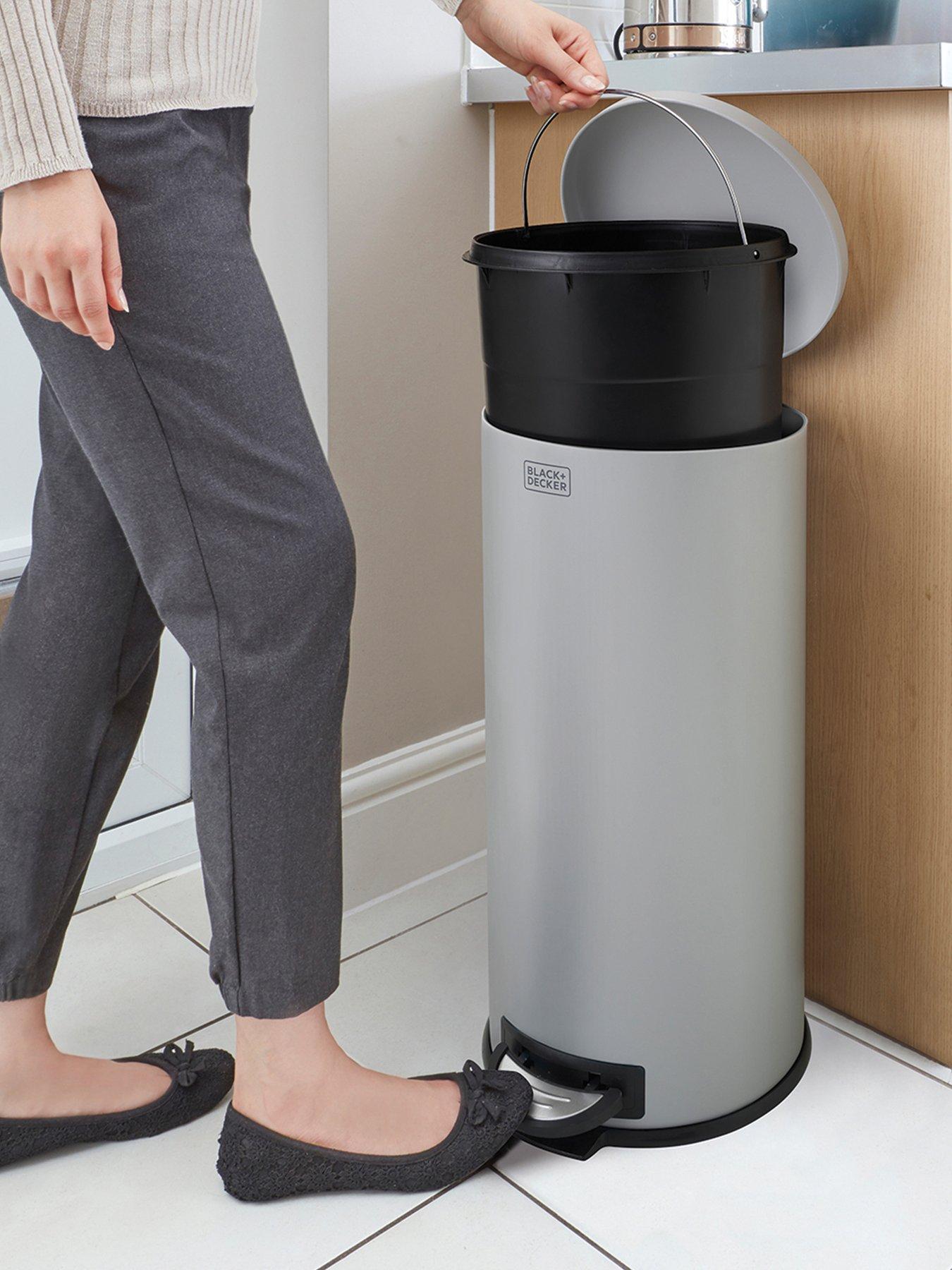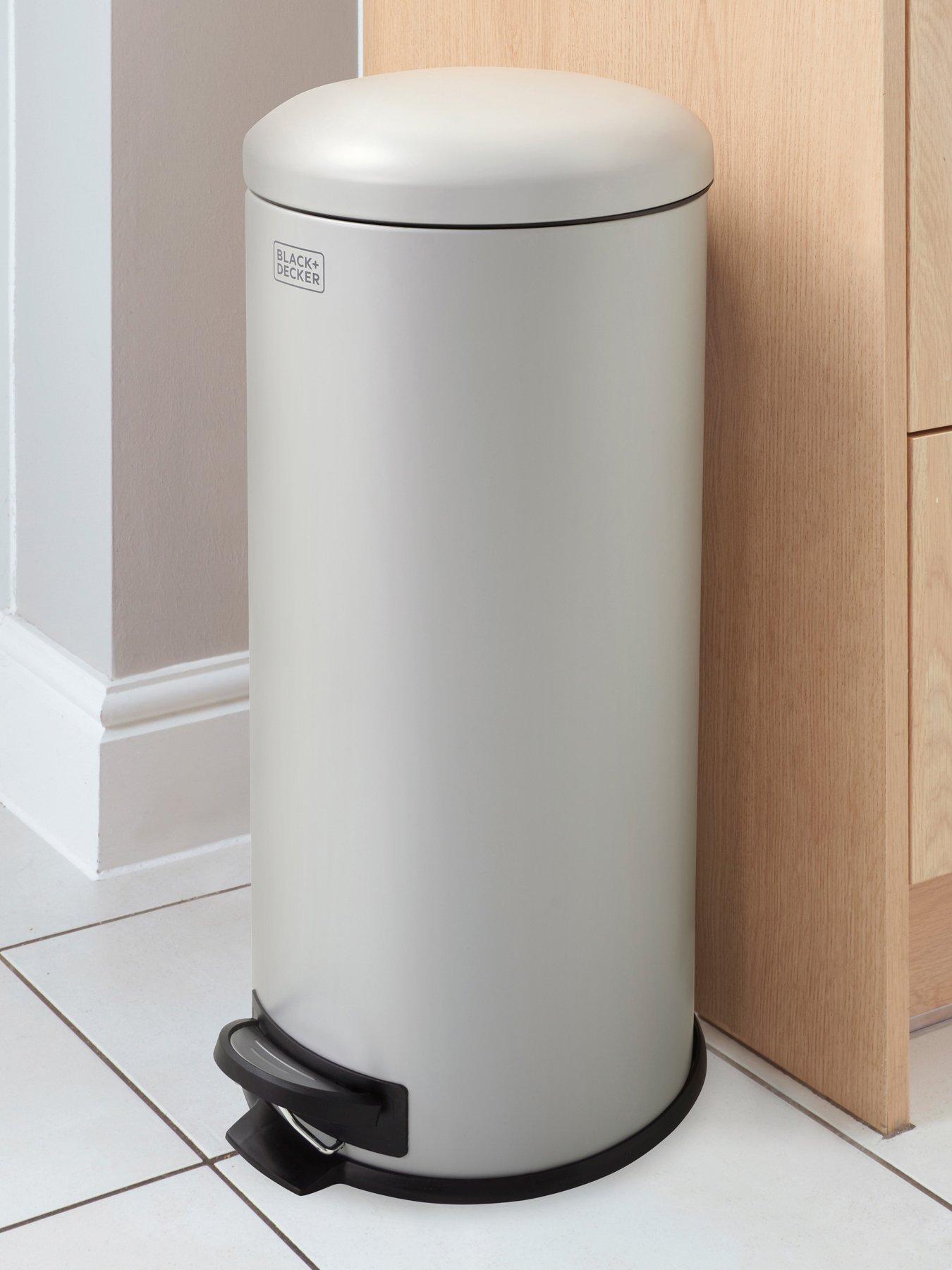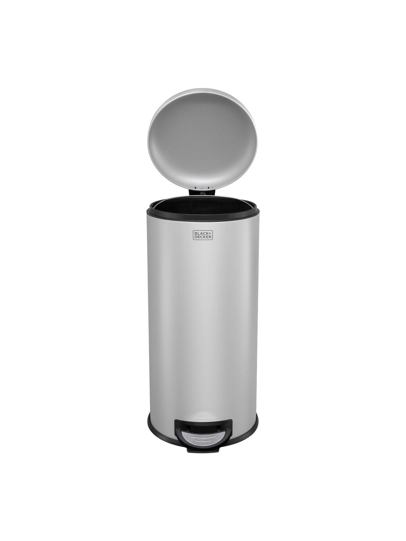Black & Decker B+d 30l Dome Lid Pedal Bin - GreyBLACK+DECKER's 30L rounded shape dome lid pedal bin is slimline, modern, practical, and makes disposing of waste simple. The bin features a soft-close lid, so that once your foot is removed from the pedal the lid will gently close. The pedal bin is grey in colour, crafted from stainless steel, and also features a hand grip at the rear to aid movement. The removable inner bucket with carry handle ensures it is easy to empty contents straight into the outside bin.