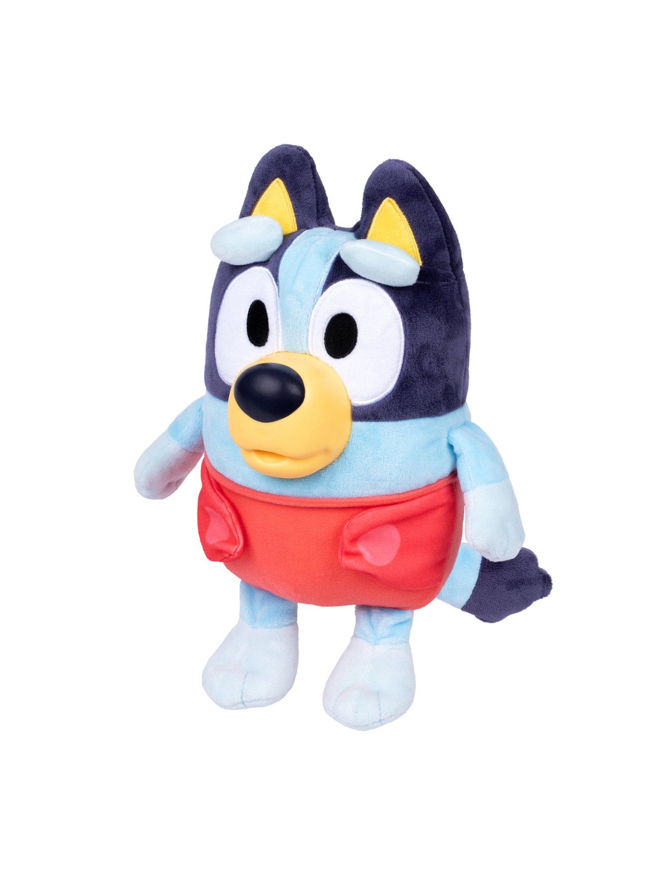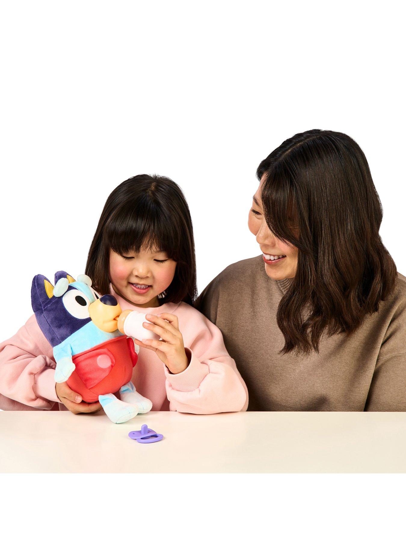 Bluey Cuddle & Care Baby Bluey With 10 SoundsSay hello to the Cuddle & Care Baby Bluey!Inspired by the episode "Baby Race", this electronic plush toy is 11" (28cm) tall, the perfect size for cuddling. Baby Bluey includes 2 accessories - a baby bottle and pacifier. Baby Bluey even has a plastic moulded muzzle so your child can place the bottle and pacifier into Bluey's mouth. Bluey's cloth diaper can be easily removed for a make-believe diaper change. When Bluey's belly is squeezed, she makes 10 different baby sounds including crying, cooing and giggles. Made from super soft plush with deluxe fabrics and beautifully embroidered details, she's perfect for cuddles and play.
