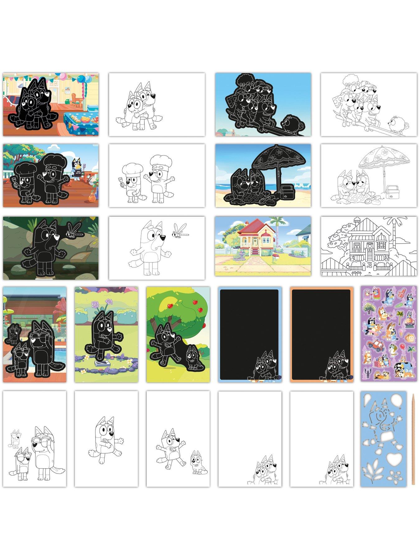 Bluey ScratchbookA fun Bluey licensed scratchbook containing 10 x scratch cards and a scratch tool. The book has 11 colour in pages (pens and pencils not included) with scenery and also comes with a sticker sheet and stencil. Use the included scratch tool to reveal Bluey and friends and use the stencil on the inner sheets and then and then colour them in and decorate them with the included stickers. Suits ages 3 years +.