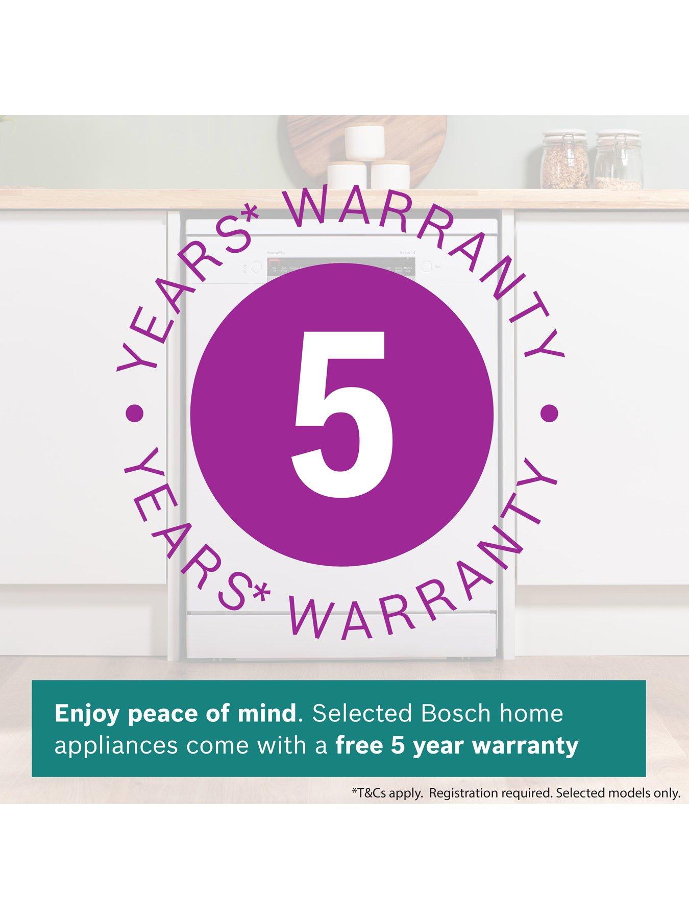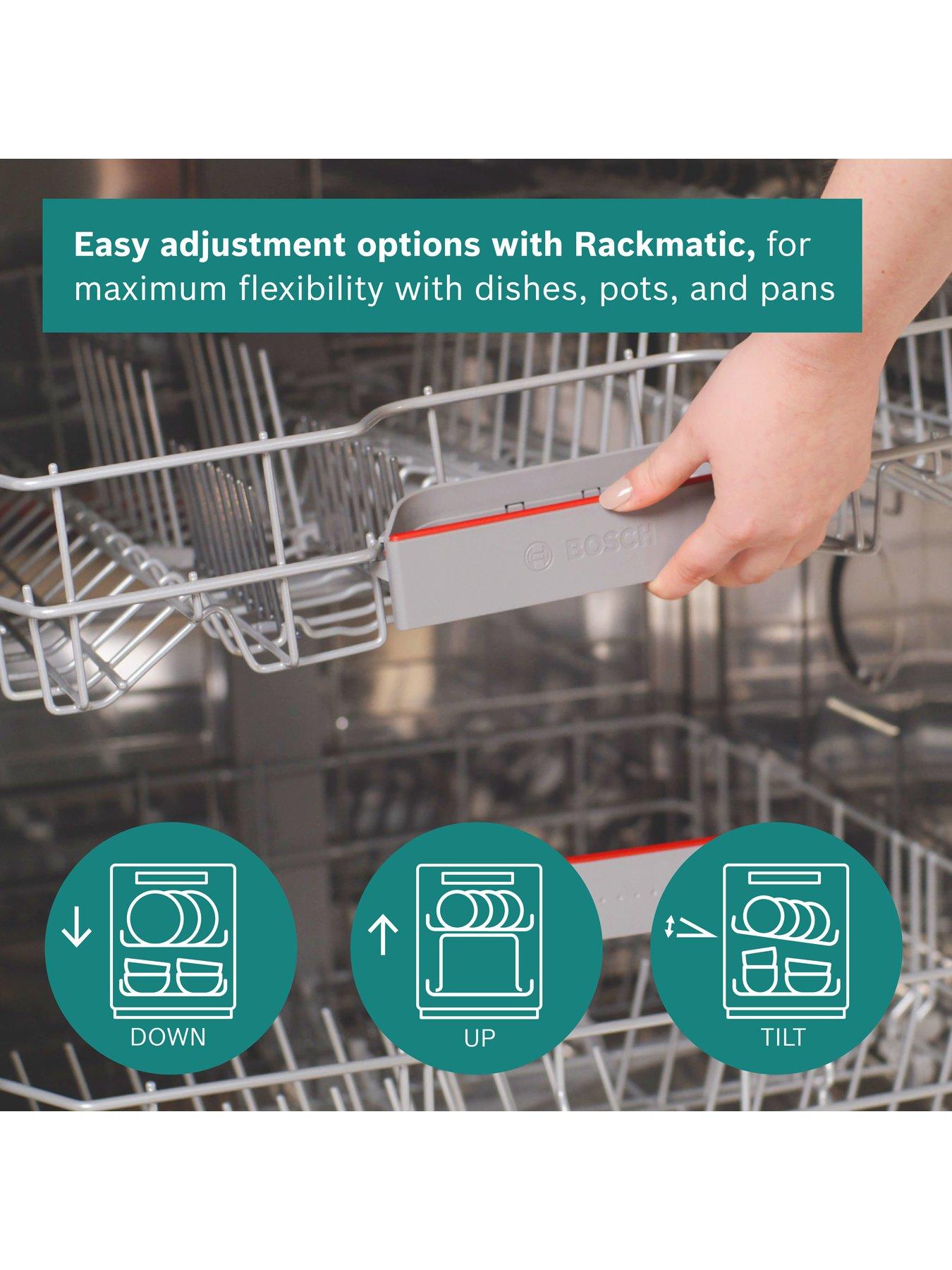 Bosch Series 4 Dishwasher SMS4EKW06G - adjusts to all your needs.Dimensions: H 84.5, W 60, D 60 cmEXTRA DRY Activating the Extra Dry option dries your dishes extra-thoroughly by using a higher temperature during the rinse cycle and a longer drying phase. SPEEDPERFECT+ Combine your favourite programme* with SpeedPerfect+ to wash and dry your dishes in up to half the time with no need to compromise on cleaning power. You can reduce the remaining program time by pressing the SpeedPerfect button, or activating SpeedPerfect+ from within the Bosch Home Connect app, even after the cycle has started. *Except: Prewash, Express 45º and Express 65° cycles. SILENCE 50° CYCLE Activating the silence programme reduce the noise levels of your dishwasher to the lowest possible volume. Ideal for using after bedtime and open-plan homes. Equipped with a brushless, energy-saving motor that reduces friction noise, the EcoSilence drive quietly gets on with the job. RACKMATIC Thanks to the triple Rackmatic system, the height of the top basket can easily be adjusted by up to 5cm, or tilted to just one side so you can fit in large pots and tall stem wine flasses, and still fit your large dinner plates on the bottom rack. AUTOMATIC PROGRAMMES Different loads require different wash settings. Bosch automatic programmes automatically regulate the water temperature and rinse time during washing to suit the level of soiling and load volume. Saving time, energy and water. HOME CONNECT Use the Home Connect app to control your Bosch dishwasher, including downloading 10 specialised cycles. 10-YEAR RUST-THROUGH WARRANTY Bosch have developed special surface treatments and production processes so they can offer a 10-year guarantee against rust through of the inner cavity.