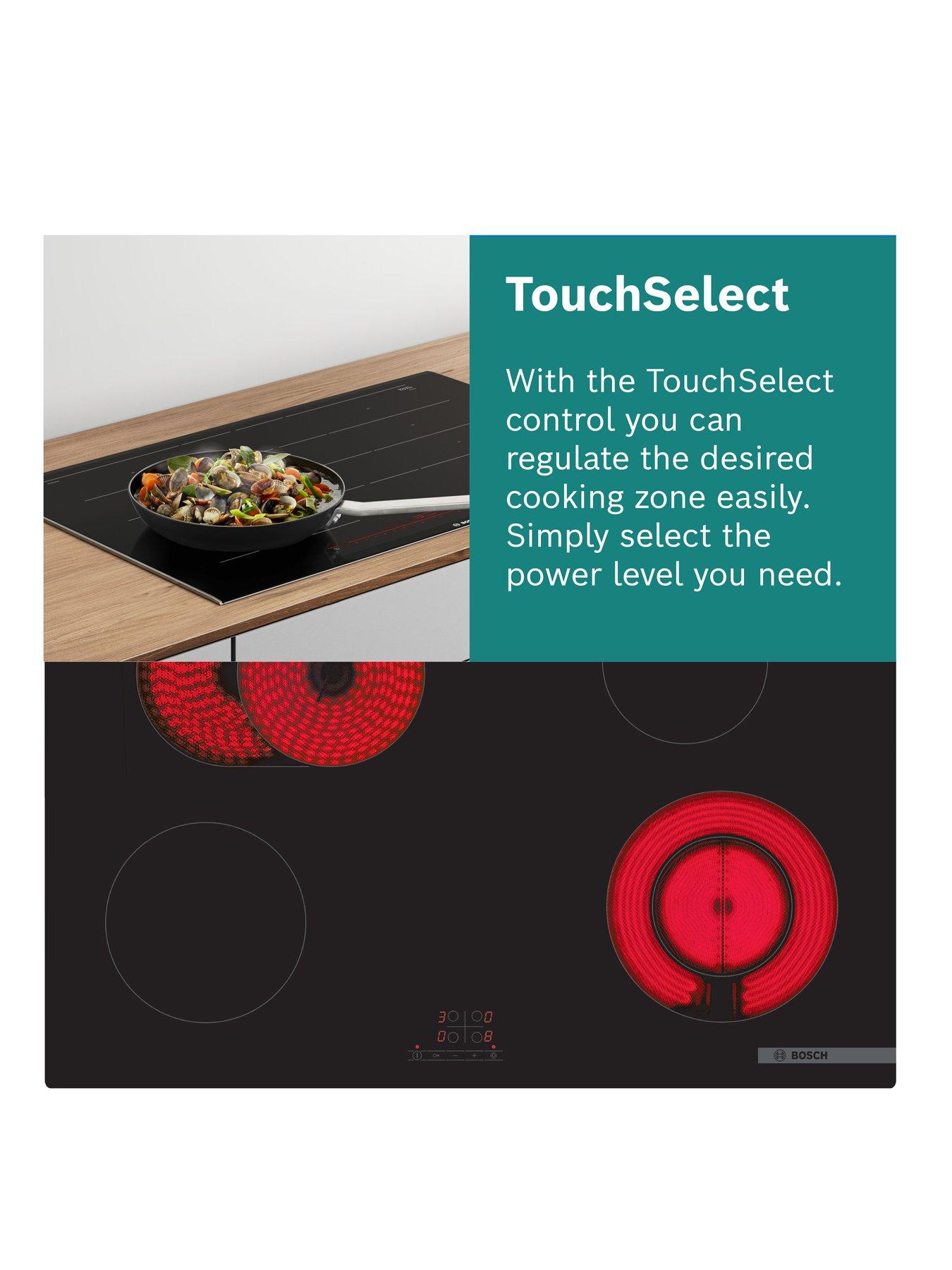 Bosch Series 4 PIE631BB5E 60cm Intergrated Induction Hob - BlackBosch Series 4 PIE631BB5E 60cm Induction Hob - Touch Control, 4 Zones, Front Bevel, 7.4kW - Black.The stylish Bosch Series 4 PIE631BB5E Induction Hob gives you precise control over your cooking. Your cooking space to create tasty meals: Induction cooking gives you the freedom and choice to choose where heat is needed, and with Faster cooking and reduced energy consumption induction cooking keeps things simple. Front Touchselect pad lets you make easy adjustments between zones and heat levels and the Quick Stop function lets you turn off a cooking zone with a single touch. PowerBoost allows you Speed up your cooking. When you want to get quick and easy meals on the table even faster, PowerBoost can help. This practical feature adds a boost of power for ultra-quick heating. Use it on your induction hob to boil large quantities of water - and heat almost 35% faster compared to the highest power level. Cookings starts much faster with QuickStart The QuickStart function detects where you have placed the pot and automatically displays the corresponding cooking zone on the control interface. You can get started straight away and select the desired cooking level for your pot without delay. Restart stores your control settings. Have you ever unintentionally switched off your hob and all settings were gone? With Restart the cooktop saves your previous settings and restores them in case you switch your cooktop on again within four seconds The handy ChildLock locks the control panel to prevent accidental changes in settings.