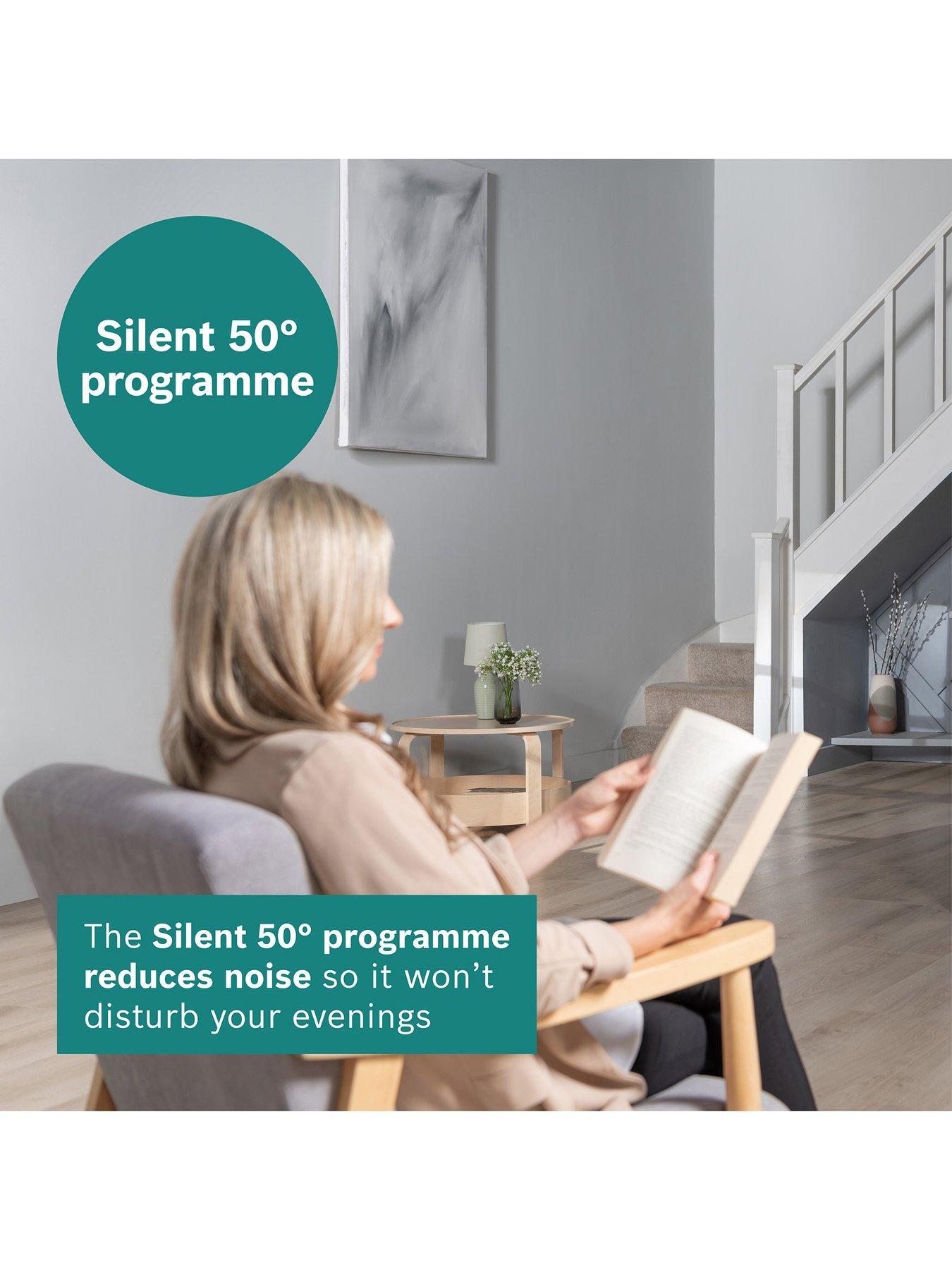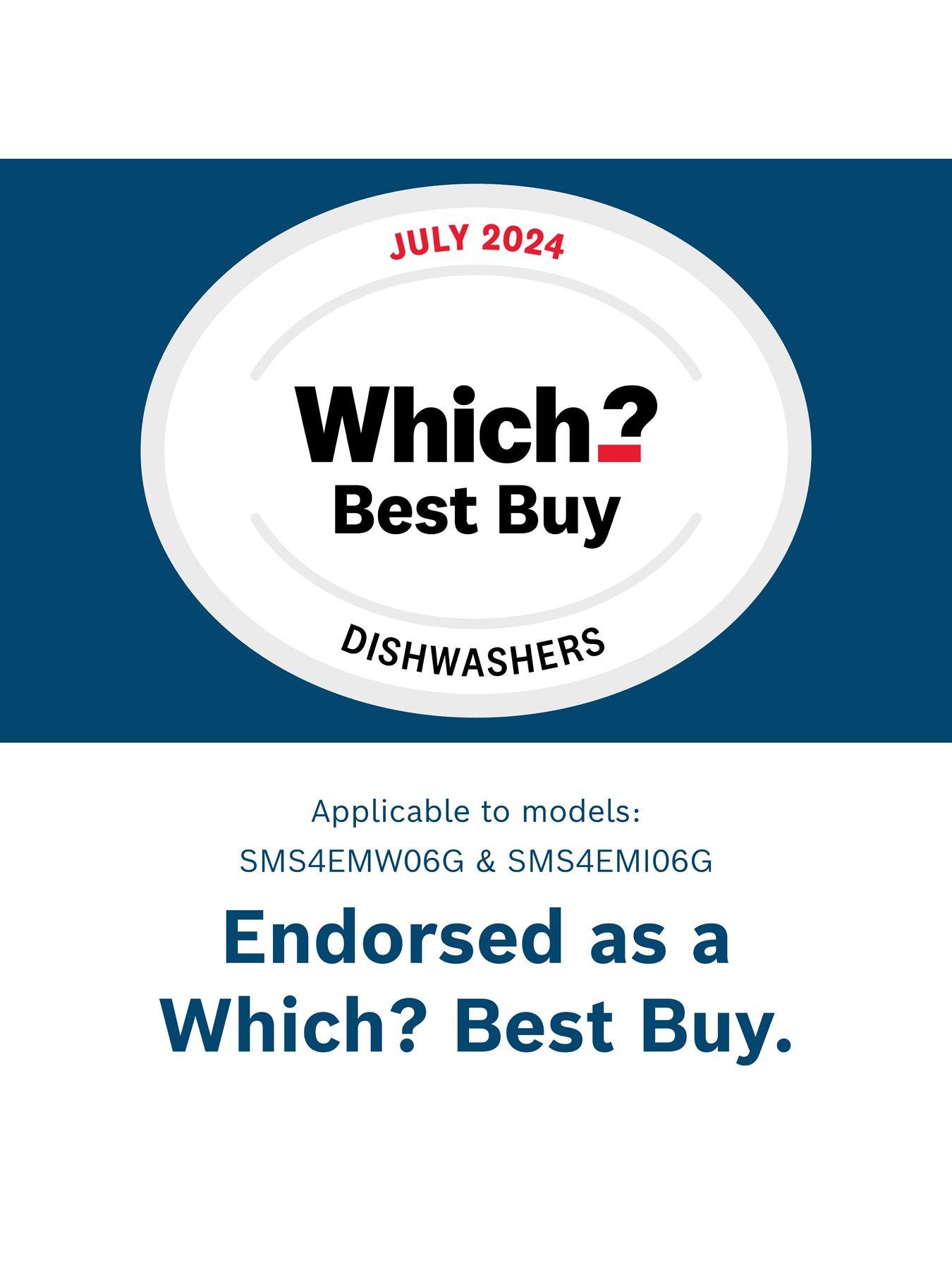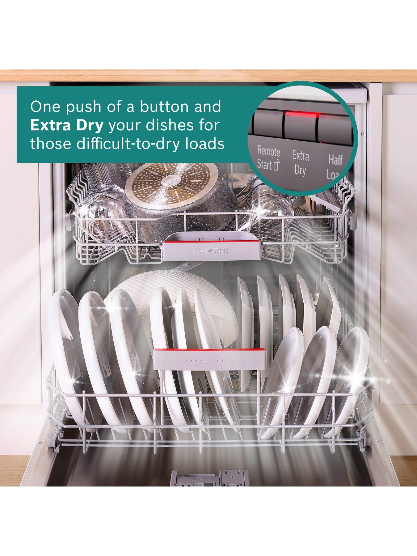 Bosch SMS4EMW06G, 60cm Dishwasher, Efficient Dry, 6 programmes, Vario Flex baskets, Vario Drawer, 5 options, 42dB, 9L, 14 place settingsActivating the Extra Dry option dries your dishes and difficult-to-dry-loads extra-thoroughly by using a higher temperature during the rinse cycle and a longer drying phaseSpeedPerfect+ Combine your favourite program* with SpeedPerfect+ to wash and dry your dishes in up to half the time with no need to compromise on cleaning power. Silence 50° program Enjoy peaceful dishwashing by activating the silence program to reduce the noise levels of your dishwasher to the lowest possible volume. Flexible Rackmatic system, the height of the top basket can easily be adjusted or tilted to just one side so you can fit in different size washing. Flexible Vario Drawer offers adjustable compartments, you can easily organise cutlery, utensils, and even small pots and pans. Home Connect Personalise your dishwasher with up to 10 additional programs with Program Download. Bosch's EcoSilence drive delivers high-performance cleaning with low noise emission. Equipped with a brushless, energy-saving motor that optimally reduces friction noise, the EcoSilence drive ensures a much smoother, quieter operation. Active Water: Bosch's innovative Active Water Plus technology maximises efficiency to produce outstanding results using less water, less energy. Programme Assistant Smart programme selection. Simply answer a few questions in the Home Connect app and the system recommends the right programme. Remote Diagnostics Simply call Bosch customer service, and with your permission, we can remotely screen your appliance, locate the issue and give you clear advice on how to solve it. Automatic Programmes Bosch automatic programmes automatically regulate the water temperature and rinse time during washing to suit the level of soiling and load volume.
