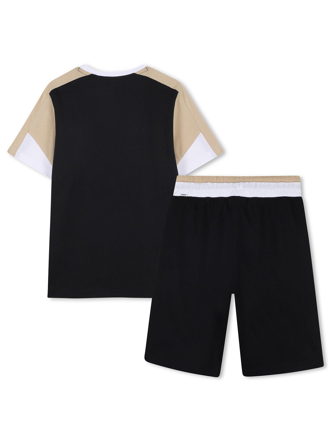 BOSS Boys Colour Block T-shirt And Short Set - BlackT-shirt and Bermuda shorts set in cotton jersey. T-shirt with color-coded shoulder cut-outs. BOSS logo on chest. Bermuda shorts with elasticated waistband in iconic colors and drawstring. BOSS logo printed at bottom.