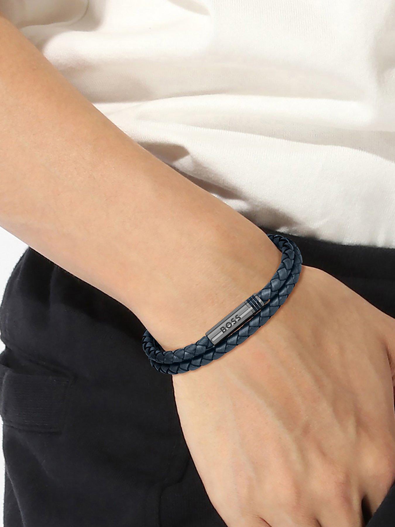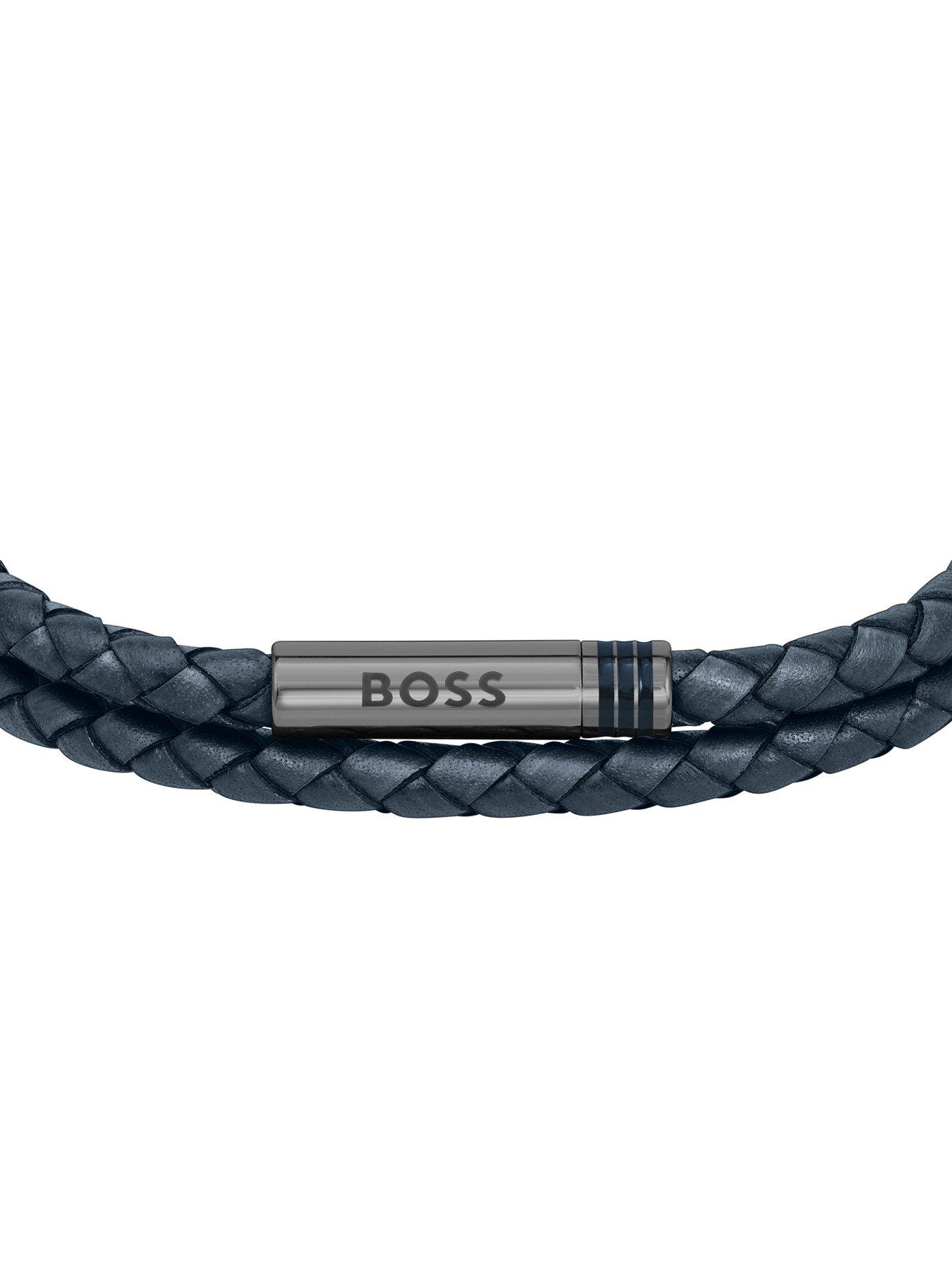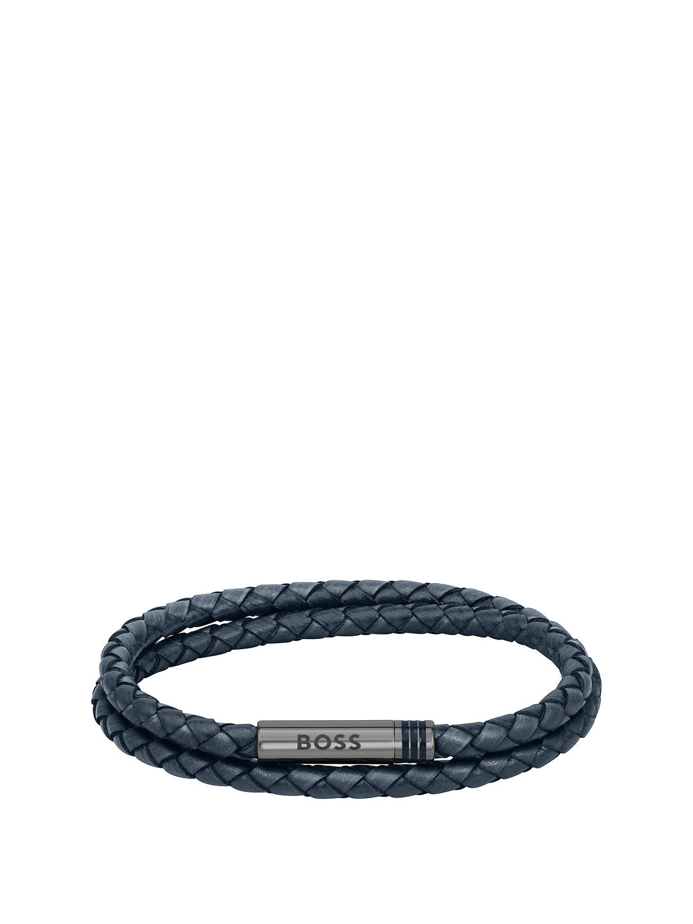 BOSS Gents BOSS Ares Navy Blue Double Wrap Leather BraceletBOSS gents navy blue double wrap leather bracelet from the Ares collection. Features braided design with grey IP magnetic closure. Length 190mm.