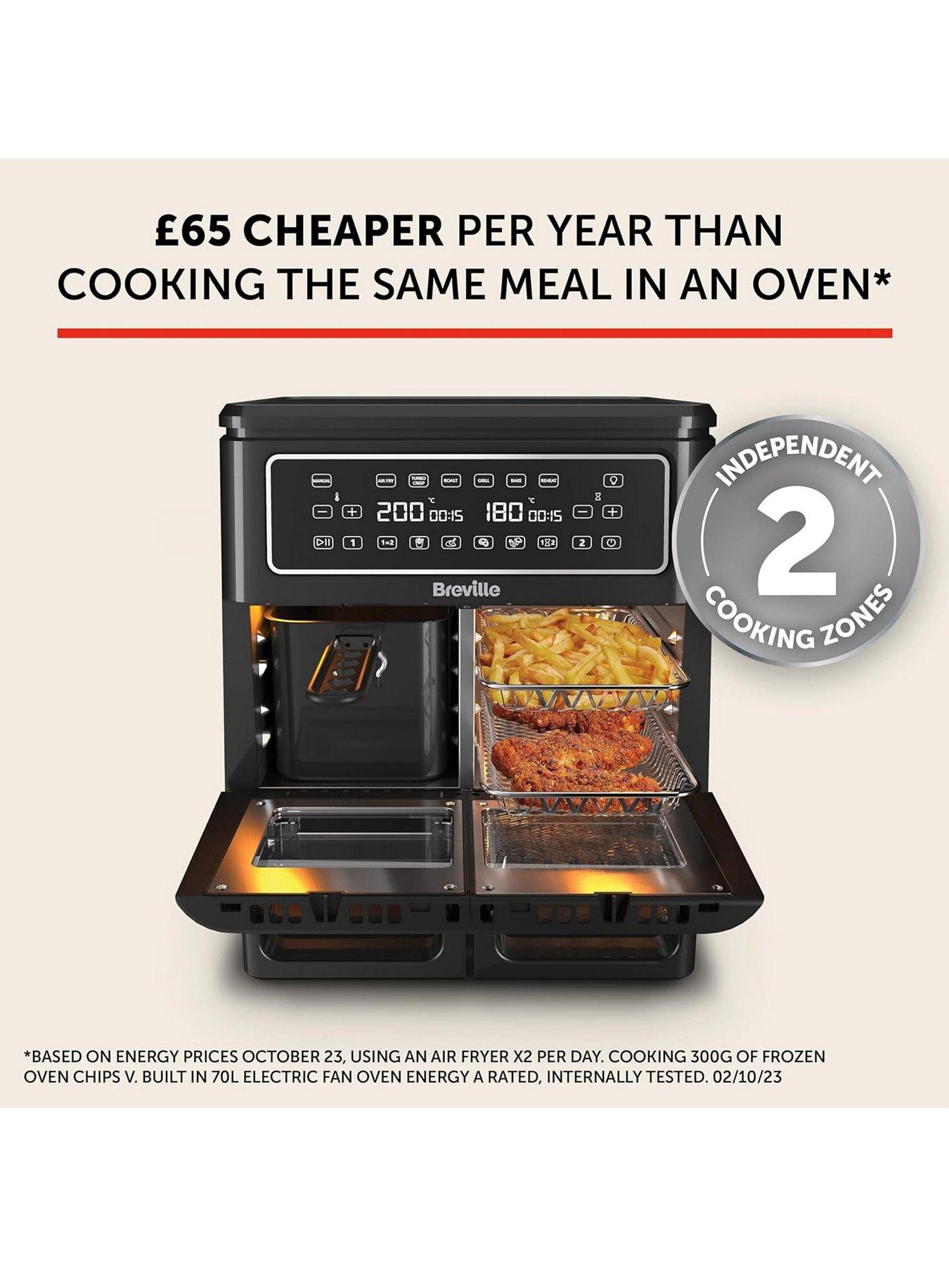 BREVILLE Halo Flexi Dual Air FryerCook what you want, when you want with the Breville Halo Flexi Air Fryer. This extra large 11L dual air fryer oven is the first with 12 ways to cook, featuring two distinct zones and a variety of configurations that offer plenty of space to cook an entire family meal... even a whole roast chicken up to 2.2kg! Clever cooking functions ensure dinner is ready whenever you are: choose Sync to cook 2 dishes, 2 ways, with both finishing at the same time, or select Match to cook food in both zones at the same time and temperature. With 10 cooking presets for chips, chicken, vegetables, steak and more, there's no limitation to what you can make. 1 appliance and 7 accessories allow you to air fry, turbo crisp, bake, grill, roast and reheat - with perfect results every time. Onboard storage and dishwasher-safe accessories make using and caring for this Breville air fryer super simple too.