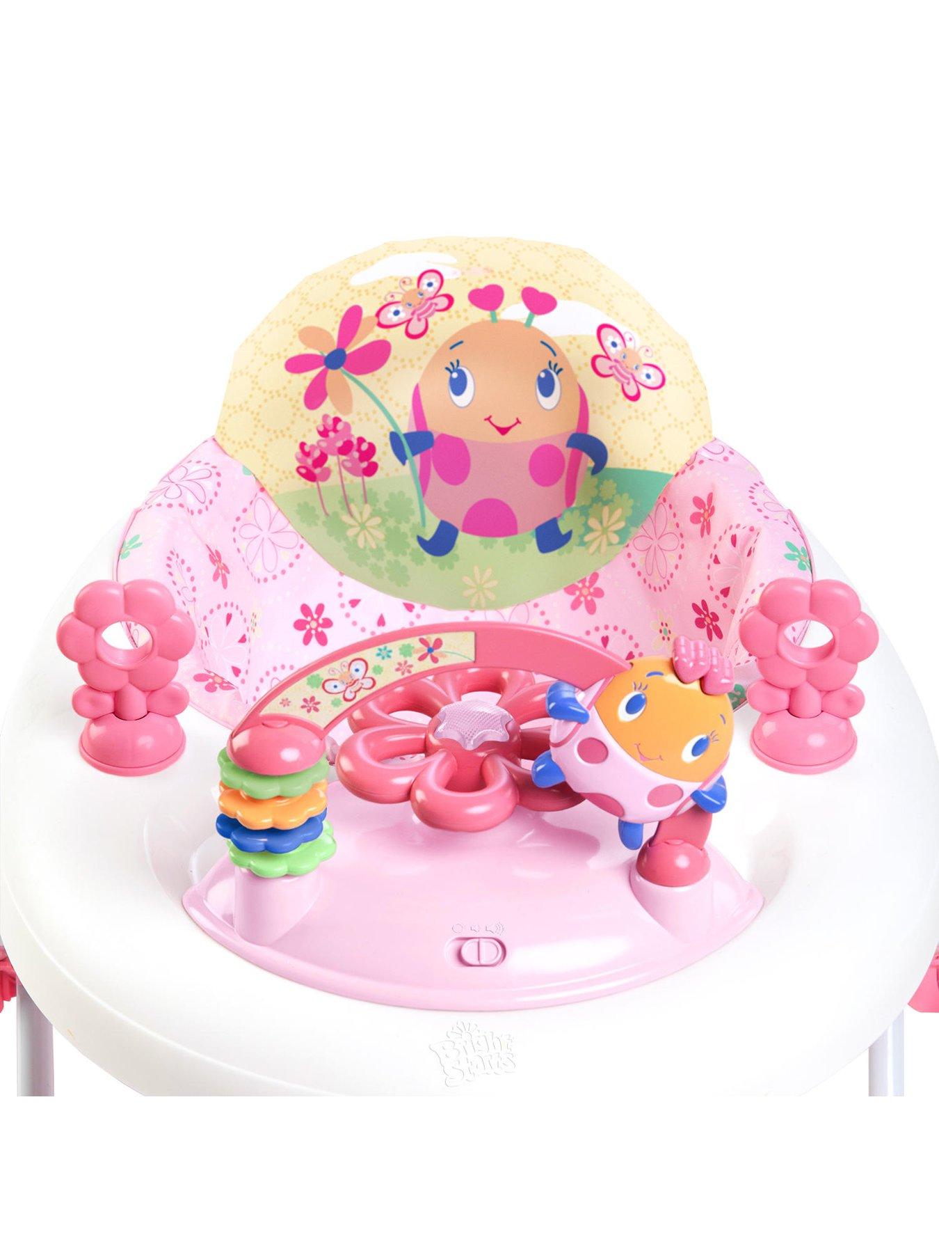 Bright Starts JuneBerry Walk-A-Bout WalkerThe Pretty in Pink JuneBerry Delight Walk-A-Bout from Bright Starts is playfully pink and perfect for your baby girl. A removable electronic toy station features a steering wheel that activates lights, sounds and melodies. It comes complete with volume control and can be removed for floor play. A high seat back provides comfort and support for baby and 3 height positions allow it to grow with baby.
