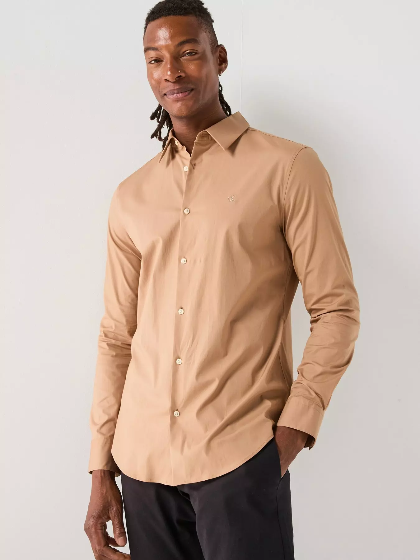 Calvin KleinLong Sleeve Solid Stretch Slim Fit Shirt - Light Brown