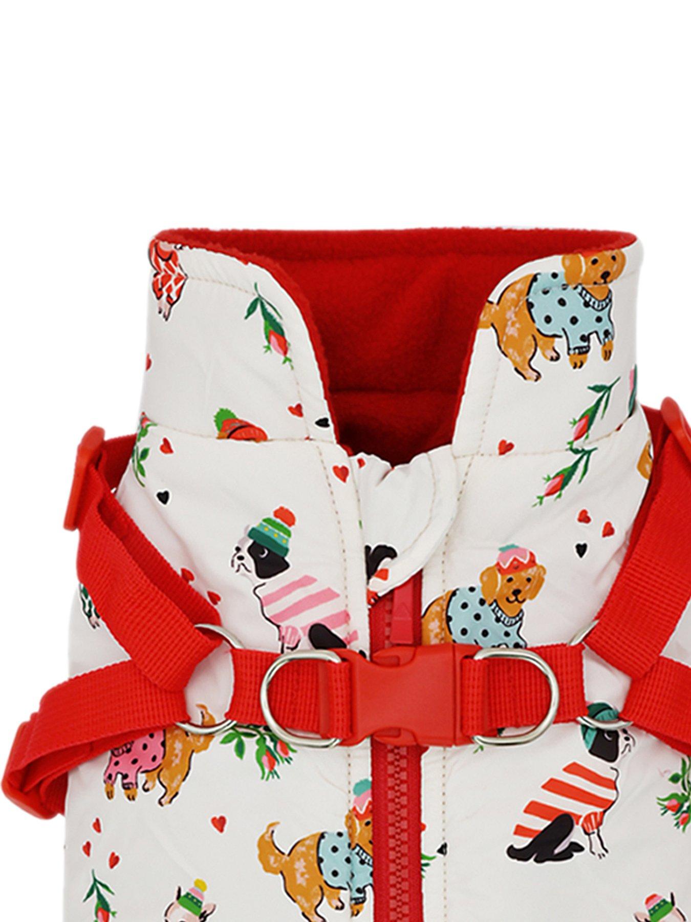 Cath Kidston Dogs & Roses Coat & Harness - stylish and super cosy!Ensure your dog stays warm and dry this season with the delightful Cath Kidston Dogs & Roses Coat & Harness. Featuring an adorable print with playful pups, this cosy coat brings festive spirit to every winter walk.Made with a soft polar fleece lining, this jumper provides gentle warmth, making it ideal for chilly walks or snug evenings indoors. The water-resistant outer layer offers protection against cold winds and light rain. The elasticated armholes and zip fastening ensure a comfortable, flexible fit, allowing your dog to move freely while staying stylish and cosy. Plus, the built-in harness adds convenience - simply attach the lead, and you're good to go. Practical as well as stylish, this coat is machine washable for easy care after every adventure. As with all pet products, regular checks for wear and tear are recommended to maintain quality and ensure your pet's comfort. Back Length: 41cm - perfectly sized for large dogs Wash & Care: