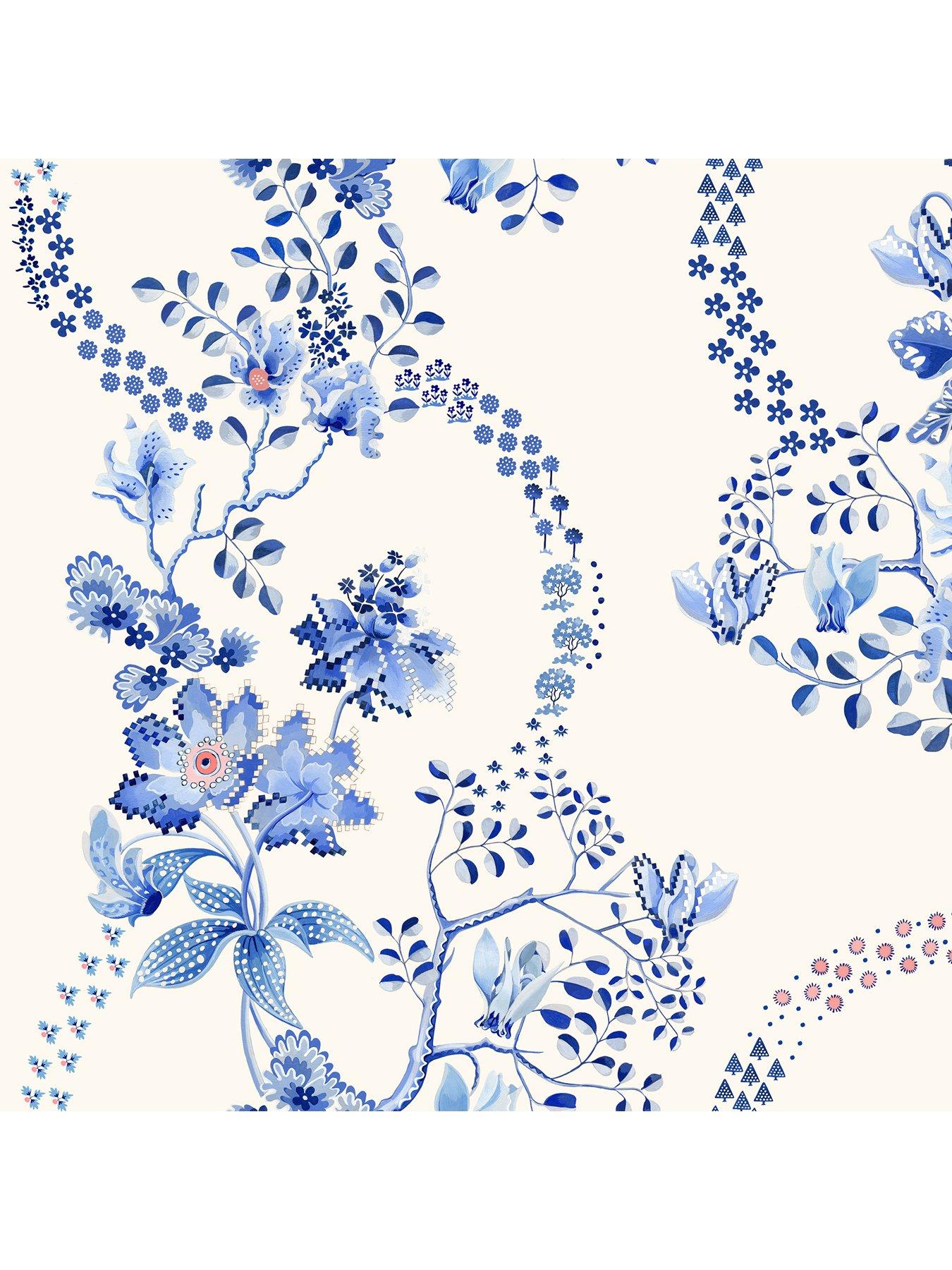 Cath Kidston Road Floral Blue & White WallpaperRoad Floral Blue & White wallpaper is a gentle ramble through trailing blooms and leafy sprigs, twirling across a warm ivory backdrop. Scattered with dainty pixel petals inspired by vintage board games and dotty details that feel sweetly hand-stitched. With a whisper of blush pink nestled amongst the blues adds just a kiss of warmth, like the inside of a china teacup.Both calming and playful, this design brings a peaceful kind of joy-perfect for quiet corners, timeless nurseries or rooms that deserve a little floral flourish.