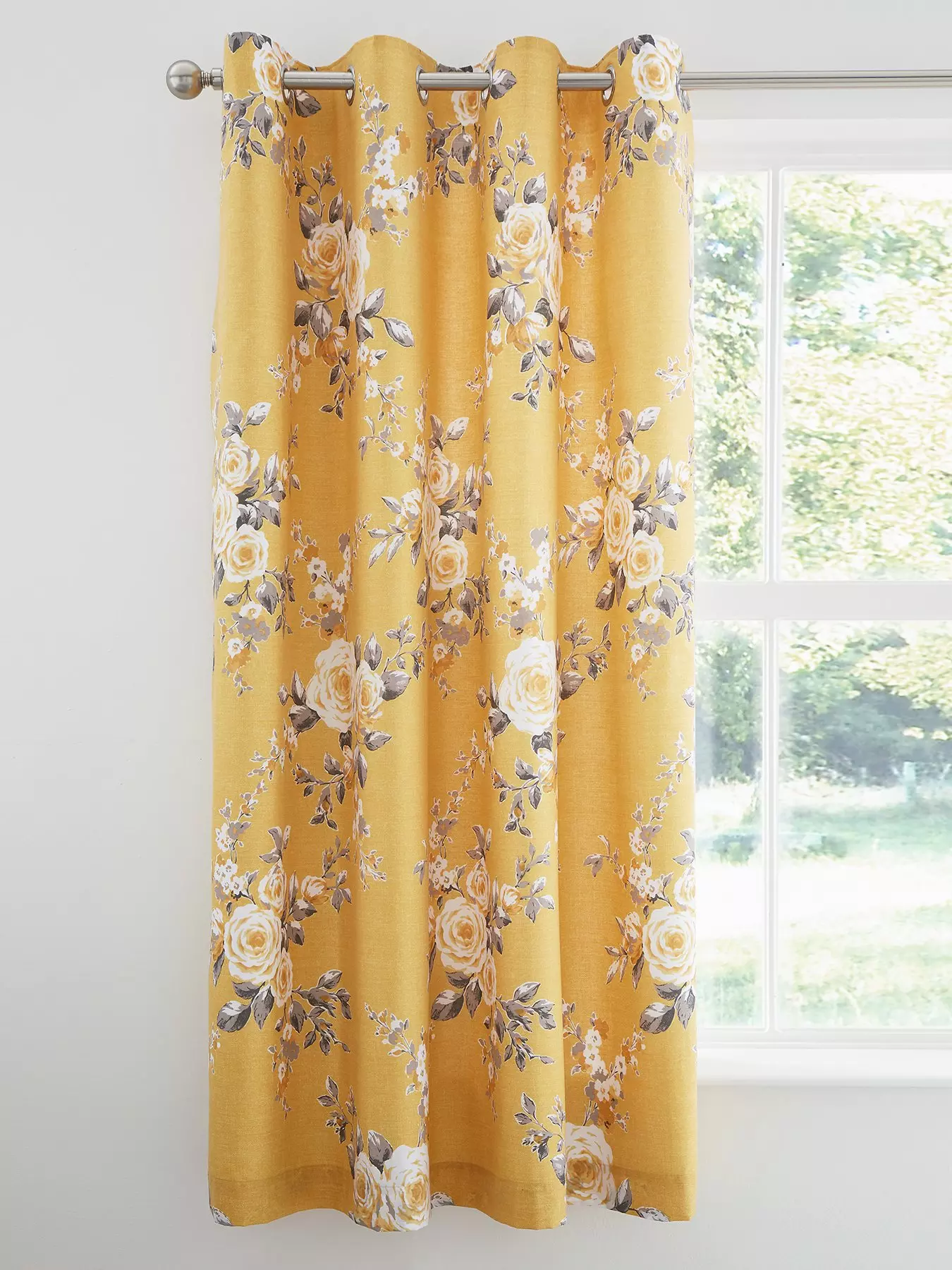 A modern interpretation on a classic look, these eyelet curtains from the Canterbury collection by Catherine Lansfield flaunt beautiful artwork and a bold colour scheme.Vibrant ochre provides the canvas for a series of blooming carnations, each spray surrounded by greyscale leaves. The intricate shading gives each flower a unique sense of depth that’s easy to love, and they’re finished with an eyelet header so they’re easy to hang from a rail without the need for hooks or rings.