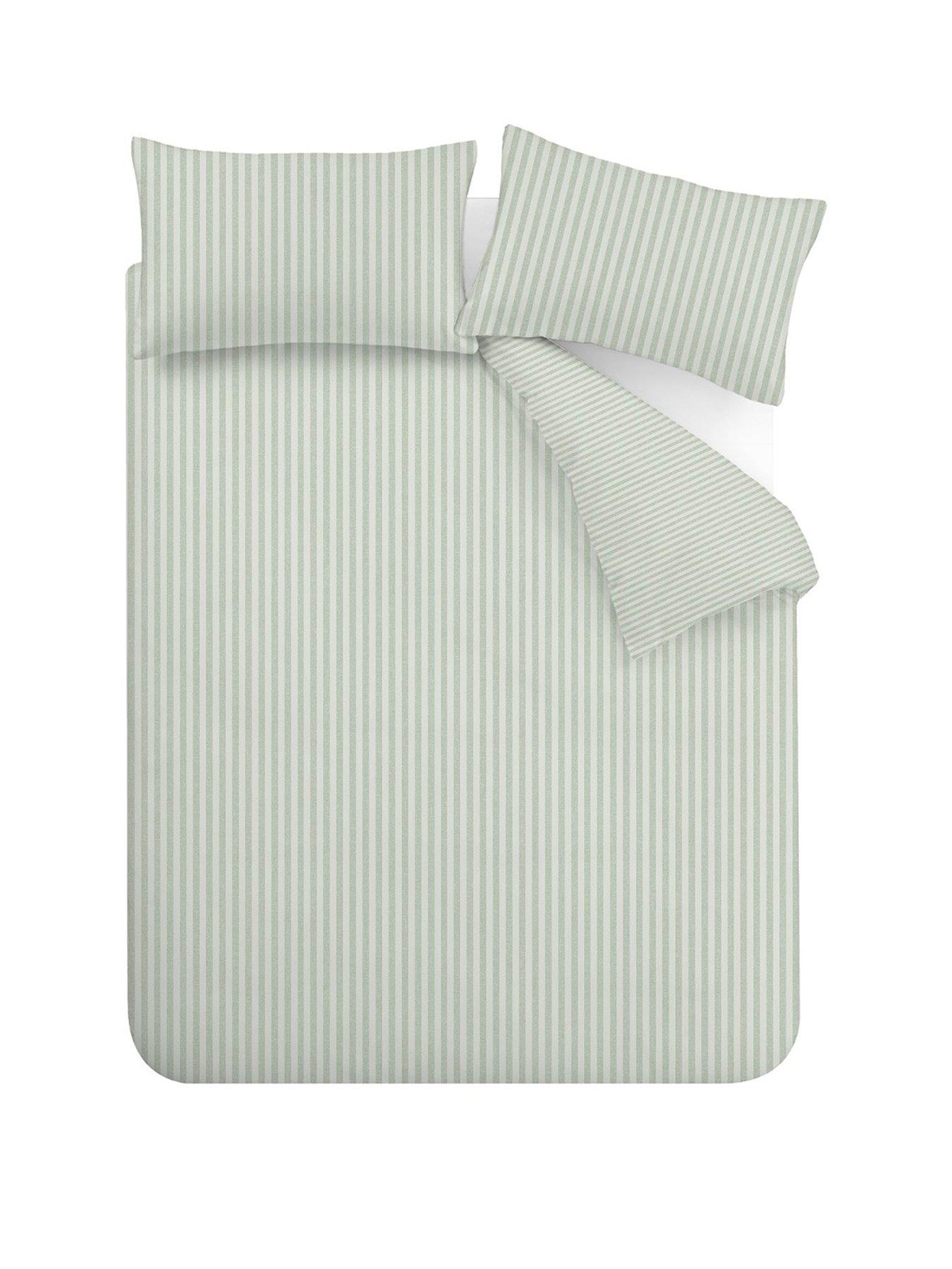 Catherine Lansfield Epping Textured Stripe Green Duvet SetCatherine Lansfield is renowned for style and quality - designed and developed in Great Britain.Bring timeless style to your bedroom with this textured stripe duvet set, crafted in soft, calming tones. Featuring bold vertical stripes on one side and a smaller scale stripe reverse, this fully reversible design lets you switch up your look with ease. Perfect for adding a touch of relaxed sophistication to any space. Created from recycled polyester and soft cotton, blended for everyday use.