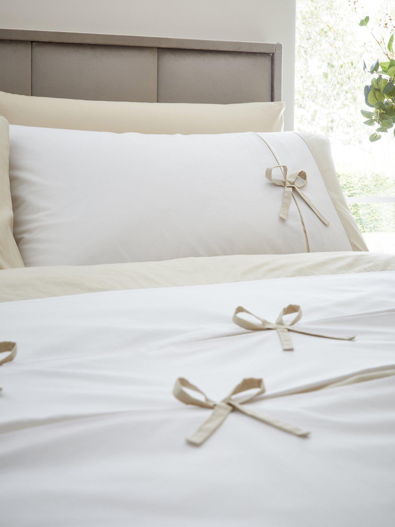 Catherine Lansfield Milo Bow Duvet Set - DbBow detail embellishment and rows of fine pleats inset with a contrast soft grey create a 3D effect on beautiful fresh white bedlinen. Created from easy-care polyester and soft cotton, blended together for everyday use.Better Cotton- By choosing our cotton product, you're supporting Catherine Lansfield's investment in Better Cotton's mission. Better Cotton is sourced via a chain of custody model called mass balance, this means that this product may not contain Better Cotton, however Better Cotton Farmers benefit from the demand for Better Cotton in equivalent volumes to those used. Learn more at //bettercotton.org/learnmore * Easy to Care: Suitable for machine washing and tumble drying. * Button Duvet Fastening: To keep your duvet securely in place. * Envelope Pillowcase Closure: Providing a secure and snug fit for your pillow.