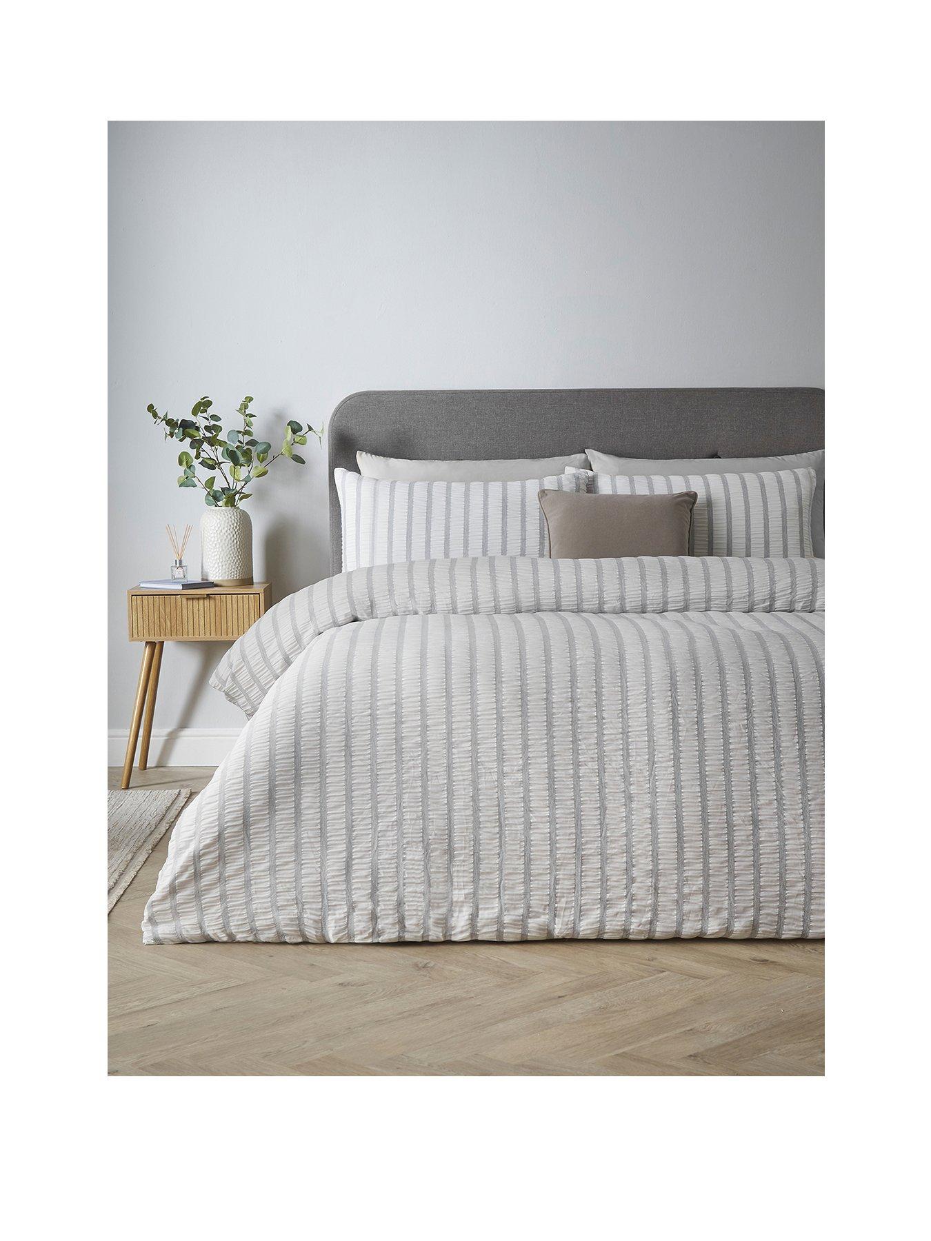 Catherine Lansfield So Soft Seersucker Stripe Duvet Set GreyCatherine Lansfield is renowned for style and quality - designed and developed in Great Britain.Alternating bands of gentle seersucker and smooth contrasting textures create a crisp, look that's both contemporary and calming. With its tonal palette and modern minimalism, this piece brings subtle dimension to your space, perfect for elevating understated interiors with refined texture and effortless style.