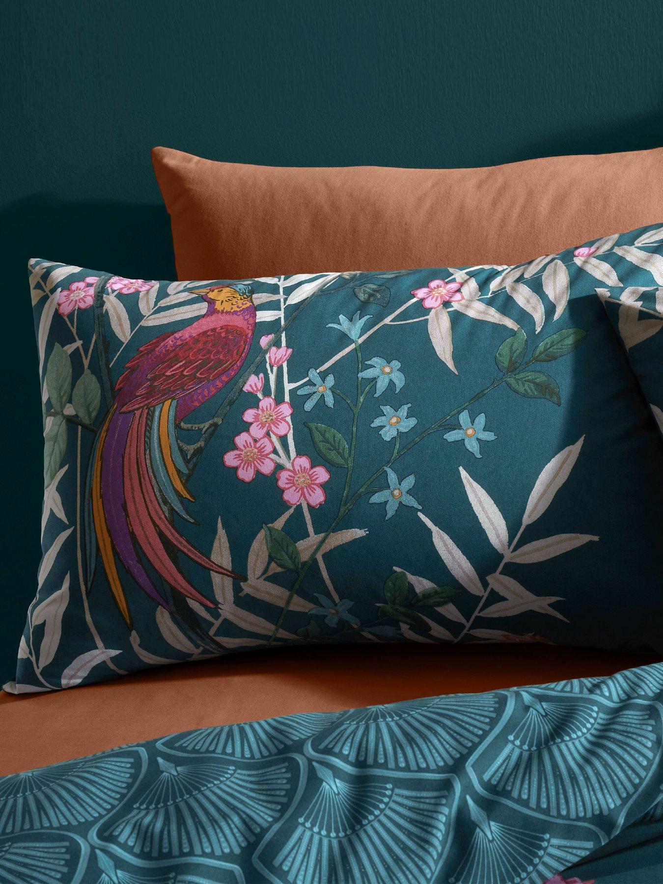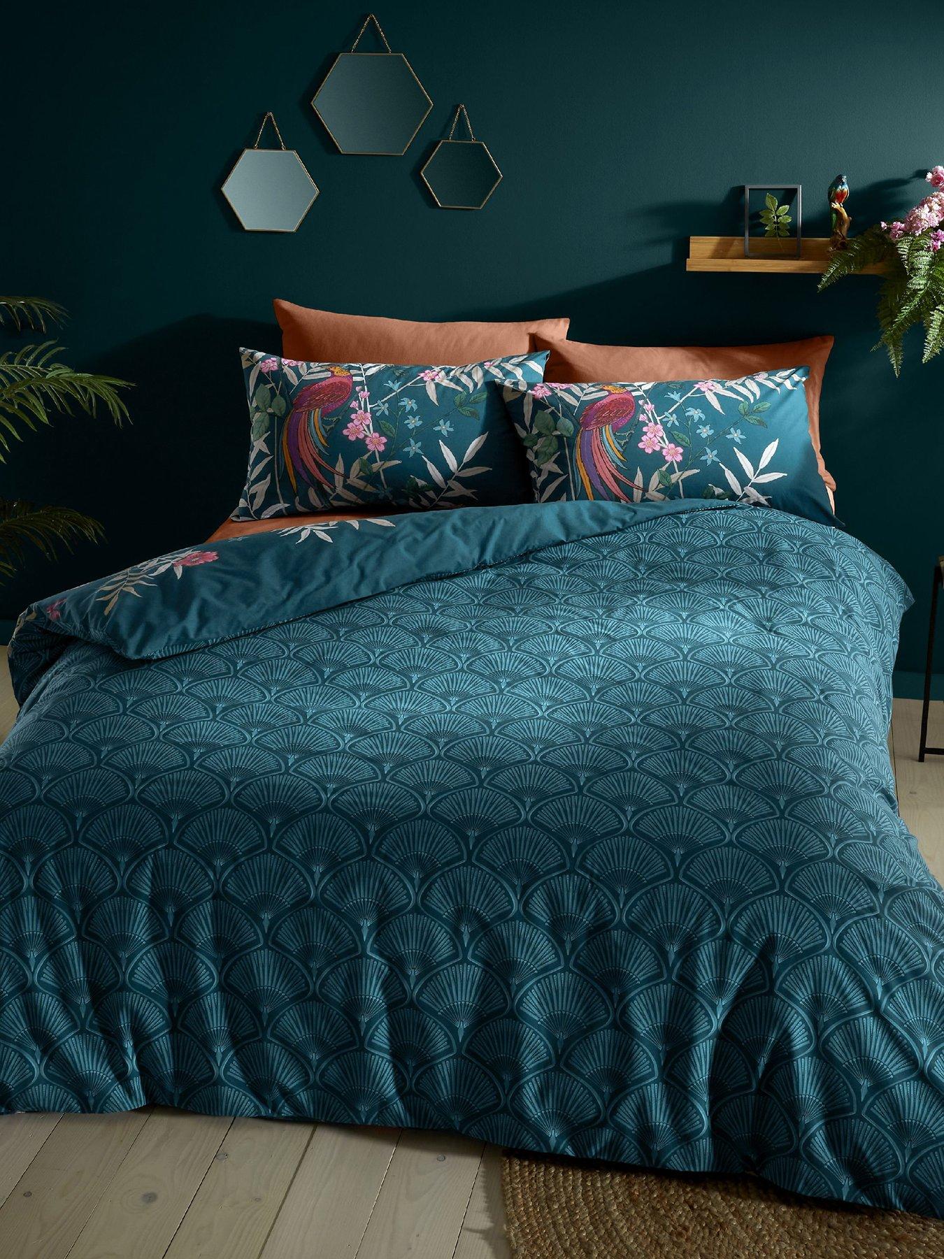 Catherine Lansfield Tropical Floral Birds Duvet Cover and Pillowcase Set in Single, Double and King sizesShowcasing the vibrant charm of an exotic getaway, the Tropical Floral Birds duvet cover set by Catherine Lansfield will make your sleep space feel like a relaxing vacay spot.Against a stunning, deep teal backdrop, it’s brought to life by bright florals and beautiful birds in a vivid palette of paradise-inspired tones. Flipping it over will reveal an all-over Art Deco-inspired sheel reverse, so you can choose your favourite look any time you like. This set comprises one duvet cover and one pillowcase in single, two pillowcases in double and king sizes.