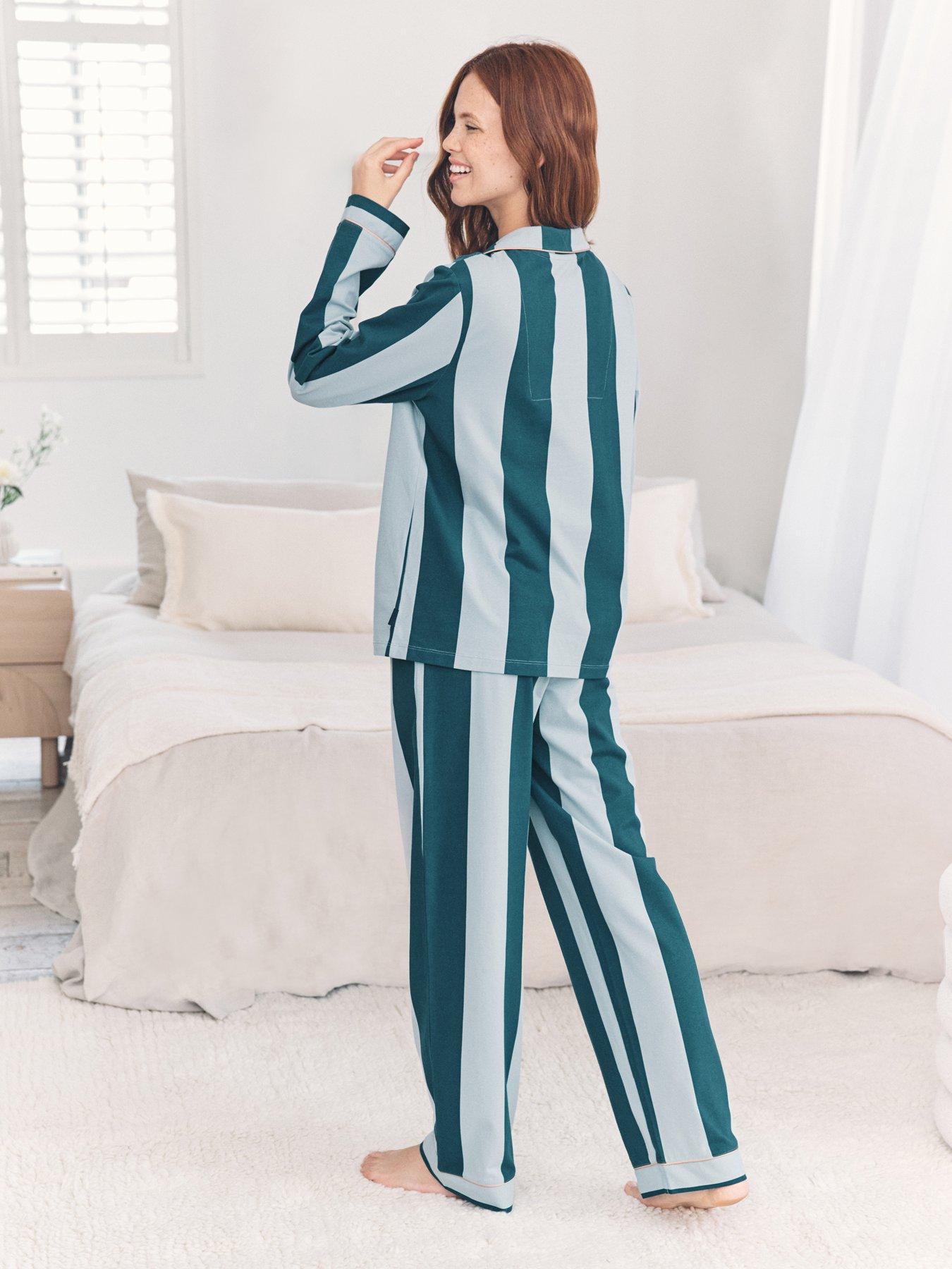 CHELSEA PEERS Classic Long Button Up Pyjama Set In CottonClassic tailoring meets bold stripes.This revere collar pyjama set is crafted from cotton, offering softness, breathability and everyday luxury. The button-up shirt is detailed with tonal piping and a chest pocket, paired with full-length bottoms featuring an elasticated waistband and side pockets for easy comfort. The chunky blue and navy stripe gives this timeless silhouette a modern, confident twist. Effortless, elevated and endlessly wearable. About the brand: Chelsea Peers creates loungewear and sleepwear with a fun, contemporary twist. Inspired by travel, pop culture and nostalgia, its prints and details bring personality to relaxed silhouettes. The brand focuses on playful comfort designed for downtime. |