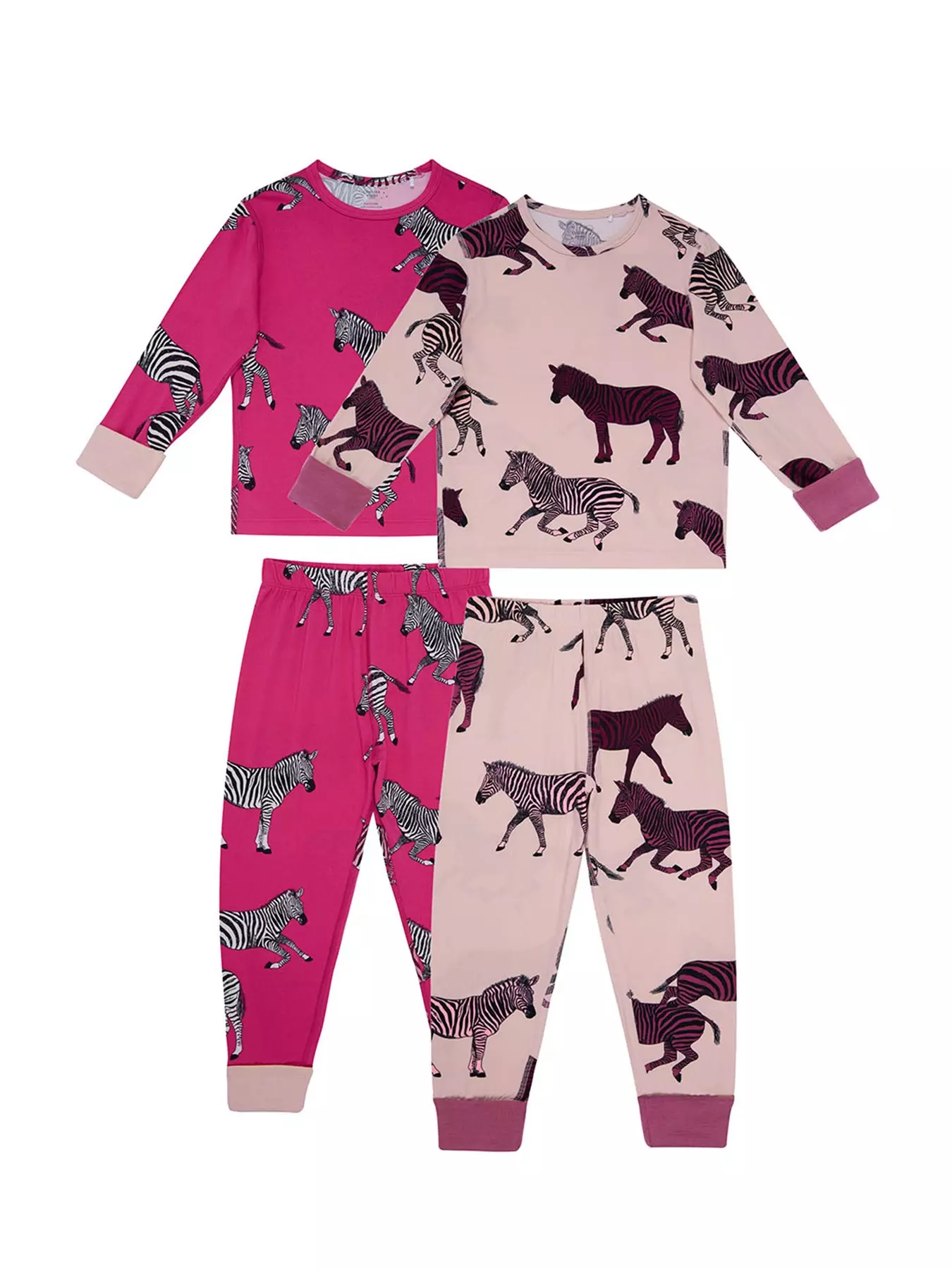 Double the fun with our hand-drawn zebras in two standout styles, dreamy purple tones on dusky pink and crisp white on bold hot pink. Each set includes a round crew neck top with long sleeves and matching bottoms, both finished with an elasticated waist for all-night comfort. Designed with grow-with-me soft cuffs that can be folded down as your little dreamer grows, and a tagless neckline for a sensory-friendly feel, these pyjamas are made from our super-soft jersey so they look great, feel even better, and are ready for countless cosy nights.- Material Content: 95% Recycled Polyester 5% Elastane