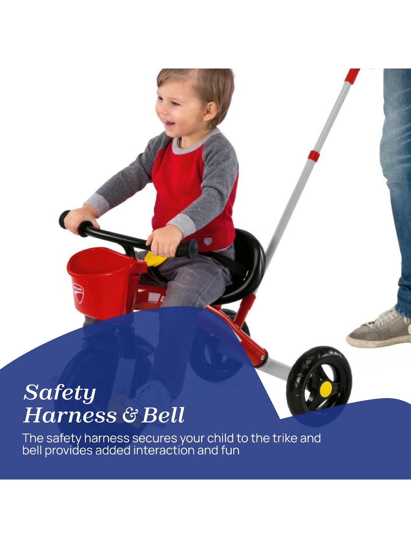 Chicco Ducati Trike"The Chicco Ducati U-Go Tricycle for kids is the perfect first ride for your little adventurers. Suitable from 18 months-5 years, it gives you two modes designed for various stages of your child's development. Push ân' Go lets you guide your little one around using the telescopic handle, which adjusts to suit parents of all heights, so you can enjoy a pleasant and comfortable stroll without the strain. Removing the handle and adjusting the front wheel, you also get Free Pedalling mode, which allows them to ride independently. The safety harness secures your child firmly in the trike and thanks to puncture-proof tyres, you get an extra level of protection. Featuring the iconic Ducati red colour scheme and sporty graphics, it makes this trike standout. It has an ultra-light metal frame to easily carry around and is sturdy enough to support a maximum weight of up to 20kg. OFFICIALLY LICENSED DUCATI CHILDS TRIKE With its stylish and sporty design, the bold Ducati red colour scheme and authentic detailing makes this trike a standout, something fans of all ages will love TWO RIDING MODES IN ONE The Chicco U-Go Ducati Tricycle for kids gives you two modes, designed for various stages of your child's development. Push ân' Go lets you guide your little one around, while Free Pedalling allows them to ride independently to boost self-confidence. Suitable from 18 months-5 years A SMOOTH & SAFE RIDE With the safety harness, you can secure your child firmly in the trike. This trike also comes with puncture-proof tyres to provide an extra level of protection to ensure a safe and comfortable ride 3 YEAR GUARANTEE Comes with standard 1 year warranty guarantee. Register for additional 2 years"