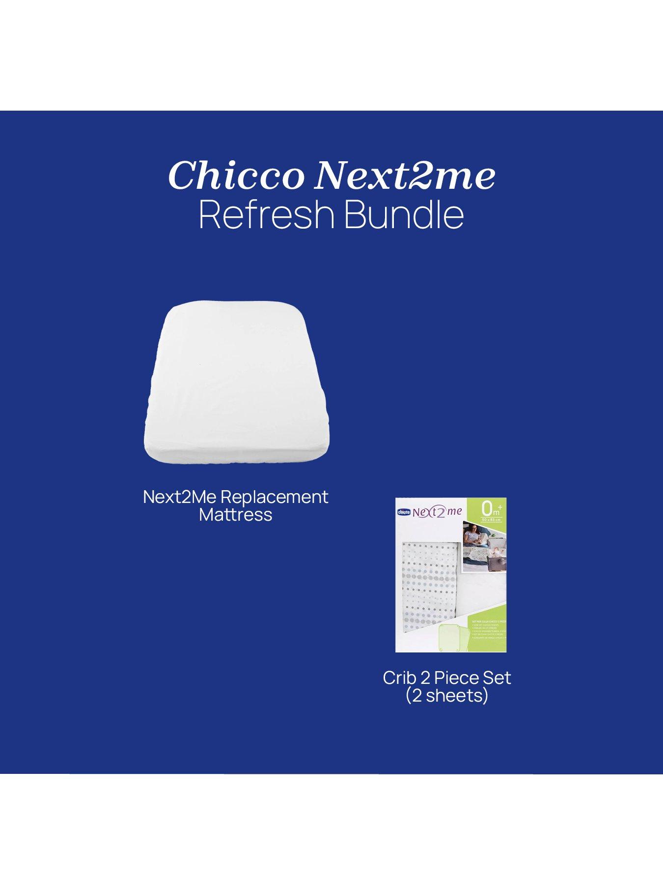 The Chicco Refresh Bundle is ideal for a new baby, it is recommended to have a new mattress for a new baby and what better than fresh bedding to go along with it.If you feel it’s time to change mattresses, then the official Chicco Next2Me replacement mattress is just what you need. It’s compatible with all Chicco Next2Me models (except for Next2Me Forever, Dream and Twins). Simply remove the wooden panel from your existing Chicco Next2Me mattress and insert into the new replacement mattress. It’s a good night’s sleep guaranteed.ORIGINAL & OFFICIAL CHICCO ACCESSORIES The Chicco Next2Me Refresh Bundle contains the original and official mattress and crib set sheets from Chicco. Giving your child the best, most comfortable night’s sleep possible PRACTICAL & EASY TO CLEAN The mattress cover is made of resistant fabric and is completely removable and washable. The padding can also be removed, and hand washed in cold water for easy cleaning. The sheets can be washed at 40° IMPROVED POSTURE SUPPORT The transpirable mattress allows air to easily pass through it, helping reduce sweating and provide enhanced posture support. A comfortable night’s sleep guaranteed LIVE. LOVE IT WITH CHICCO We’ve been there and seen it all here at Chicco. For over 60 years we’ve made the journey of parenthood smoother. Parents, parents-to-be and caregivers - we listened! Our expertly crafted, innovative tools will help the needs of you and your children