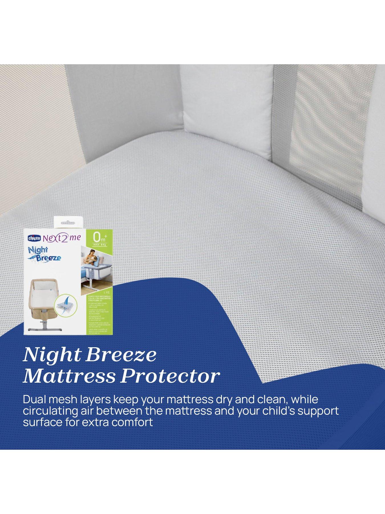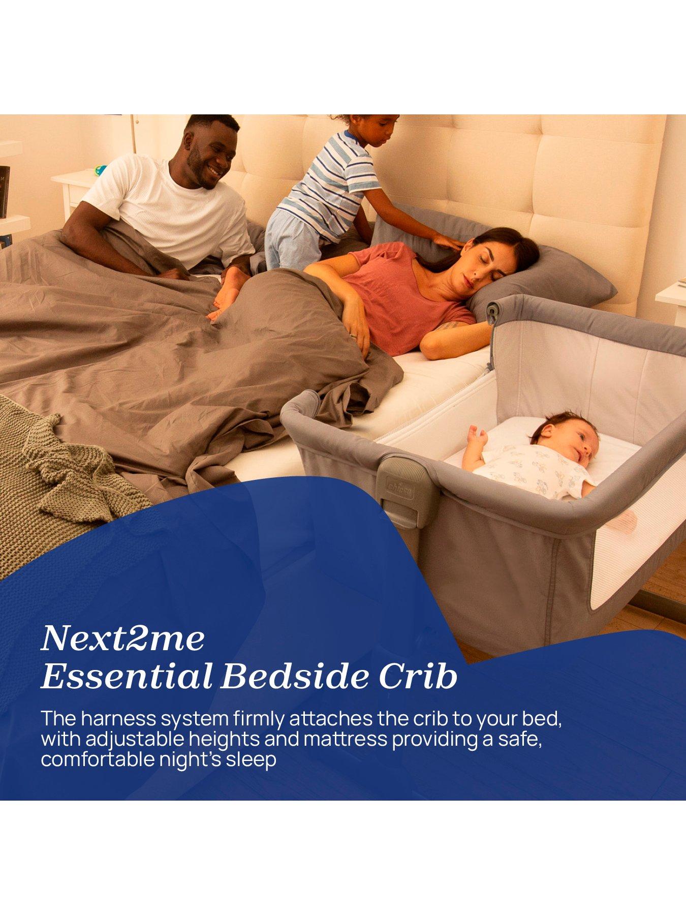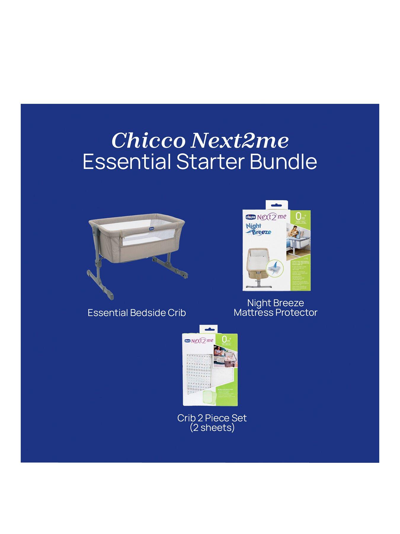 The Next2Me Essential Starter Bundle is a complete collection of our sleeping essentials for your little one to enjoy the best night’s sleep.The Next2Me Essential bedside crib is environmentally friendly, with 62% of the mattresses soft fabric made of recycled polyester. The mattress topper features a double layer of mesh and waterproof materials, with a honeycomb material that provides efficient air circulation. The Air fitted sheets are 100% cotton with temperature regulation to keep baby comfortably cool.CHICCO NEXT2ME ESSENTIAL STARTER BUNDLE The Next2Me Essential bundle is a complete collection of our sleeping essentials for your little one to enjoy the best night’s sleep, all in one convenient, cost-saving collection NEXT2ME ESSENTIAL BEDSIDE CRIB The Chicco Next2Me Essential bedside crib is environmentally friendly, with 62% of the mattresses soft fabric being made of softgood fabric that’s recycled polyester. It’s simple harness system firmly attaches the crib to your bed, providing a guaranteed safe night’s sleep for your little one and peace of mind for you NIGHT BREEZE MATTRESS TOPPER Packed with dual layer protection, this cot mattress topper features a double layer of mesh and waterproof materials. This improves ventilation to reduce sweating, while keeping the mattress dry and clean. It’s also made from a breathable, honeycomb material that provides efficient air circulation. Create a comfortably cool night’s sleep for your little one CRIB 2 PIECE SET (2 SHEETS) This set of fitted sheets are made with 100% cotton and offer the unique ability to aid temperature regulation, so your baby has a comfortably cool night’s sleep 3 YEAR GUARANTEE Comes with standard 1 year guarantee. Register for additional 2 years