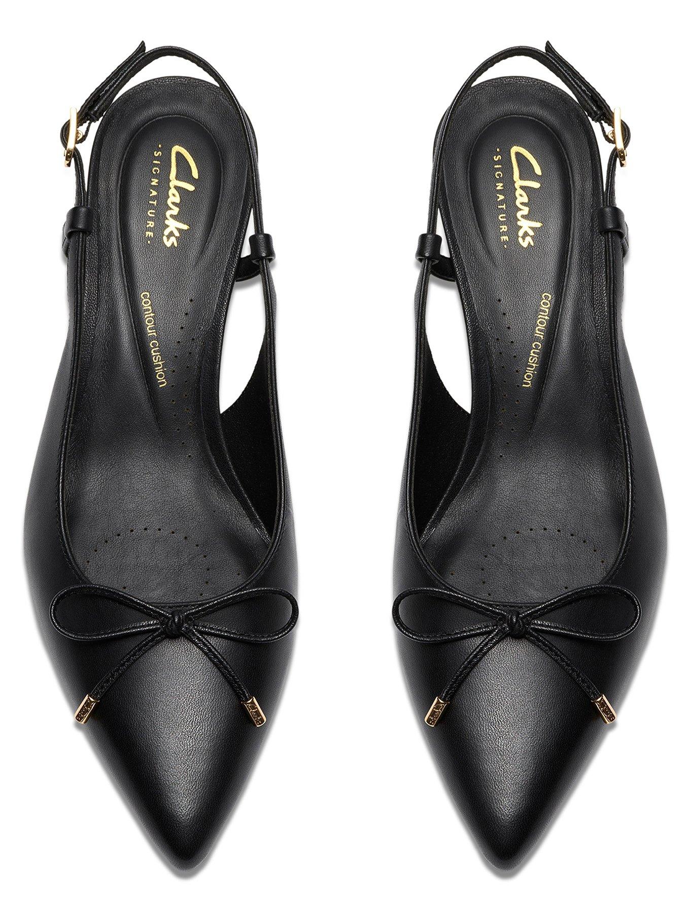 Clarks Zarey Bow Leather Sling Back Court - BlackSlingback shoe Zarey Bow calls on a sleek pointed-toe shape and a timeless, sculpted heel for sleek, elegant style. Crafted from premium materials in versatile and seasonal colours, it makes use of our ultra-comfortable Contour Cushion footbed for all-day underfoot support.- Premium leather upper with bow and gold aglet details - Slingback strap with adjustable buckle fastening delivers a secure, custom fit - Trending pointed toe shape - Breathable leather sock - Durable, flexible rubber outsole offers excellent traction - Heel height: 55mm
