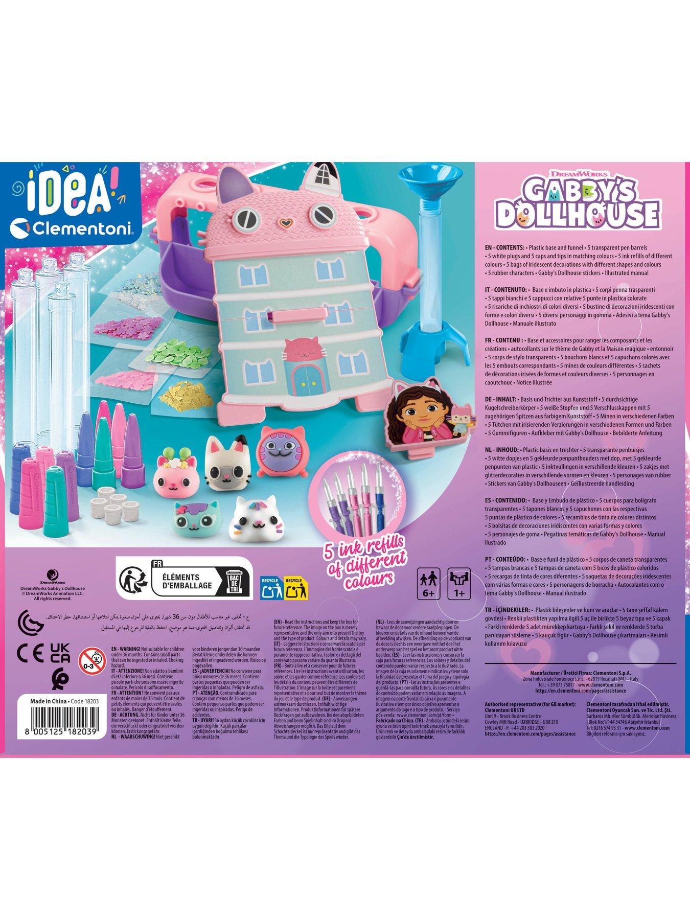 Clementoni Idea Pen Creator Gabbys DollhouseThe new Gabby's Dollhouse Pen Creator Studio!The perfect kit to create beautiful pens in true Gabby's Dollhouse style. With a practical work station and a wide range of tools to personalise your pens with lots of accessories and cute Gabby's Dollhouse character toppers! The kit includes 5 pens featuring the respective characters, coloured inks, iridescent decorations, stickers to personalise the workbench, and everything you need to unleash your creativity. A creative activity that sparks imagination. Suitable for 6 years and over. Italian designed and made.