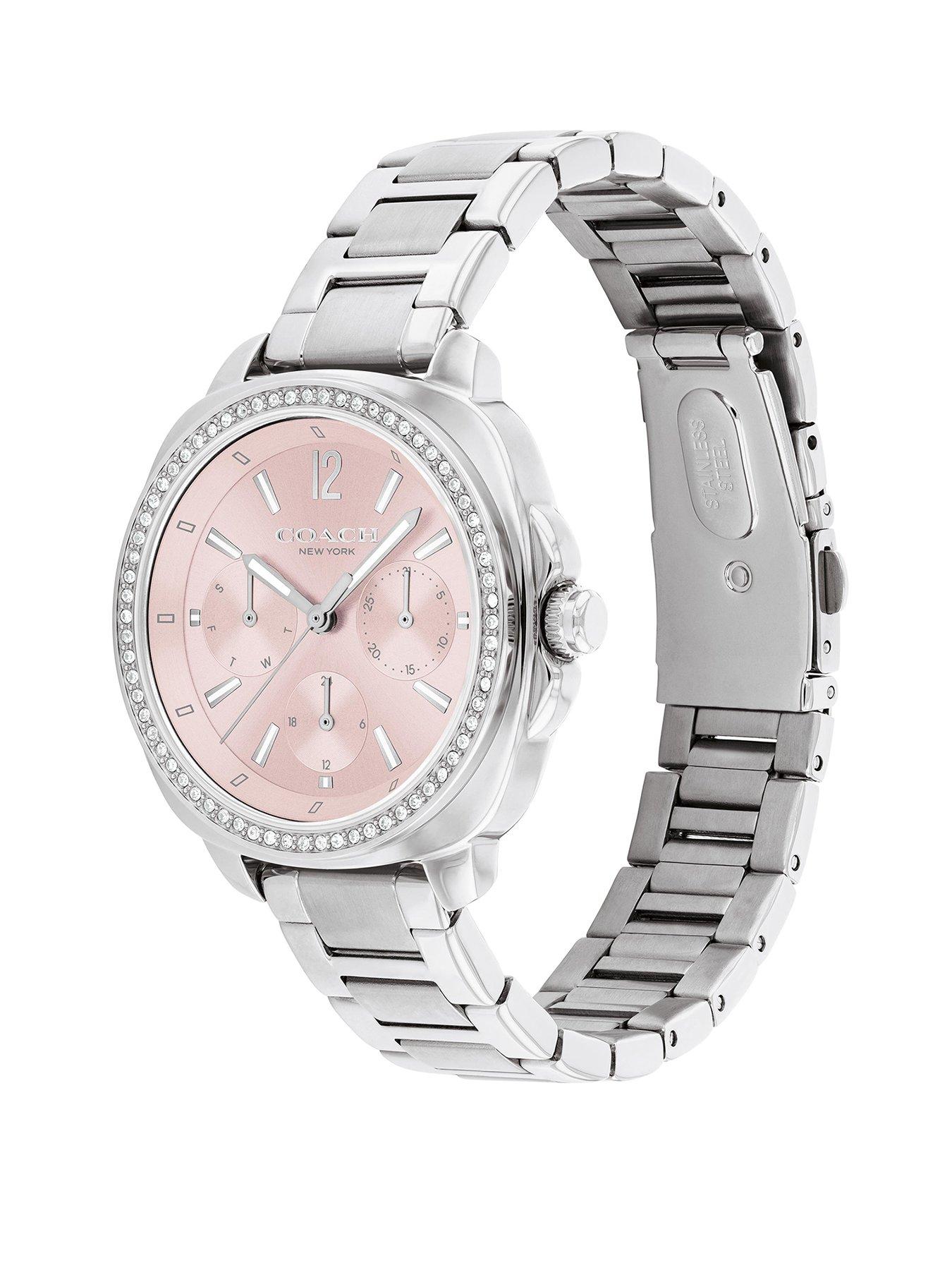 Coach Ladies Kitt Stainless Steel Bracelet WatchLadies Coach watch from the Kitt family. Featuring a 34mm cushion shaped stainless steel case with crystal set bezel, blush sunray dial, three link stainless steel bracelet. Water resistant to 3 ATM.