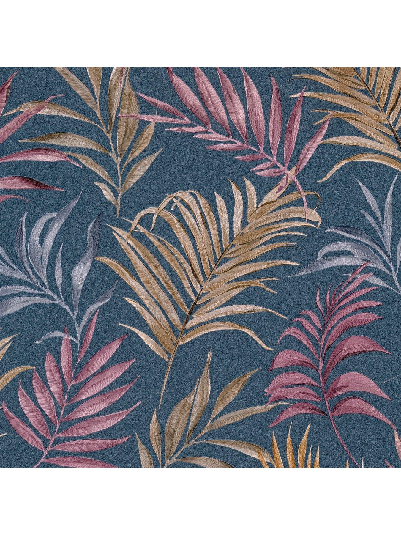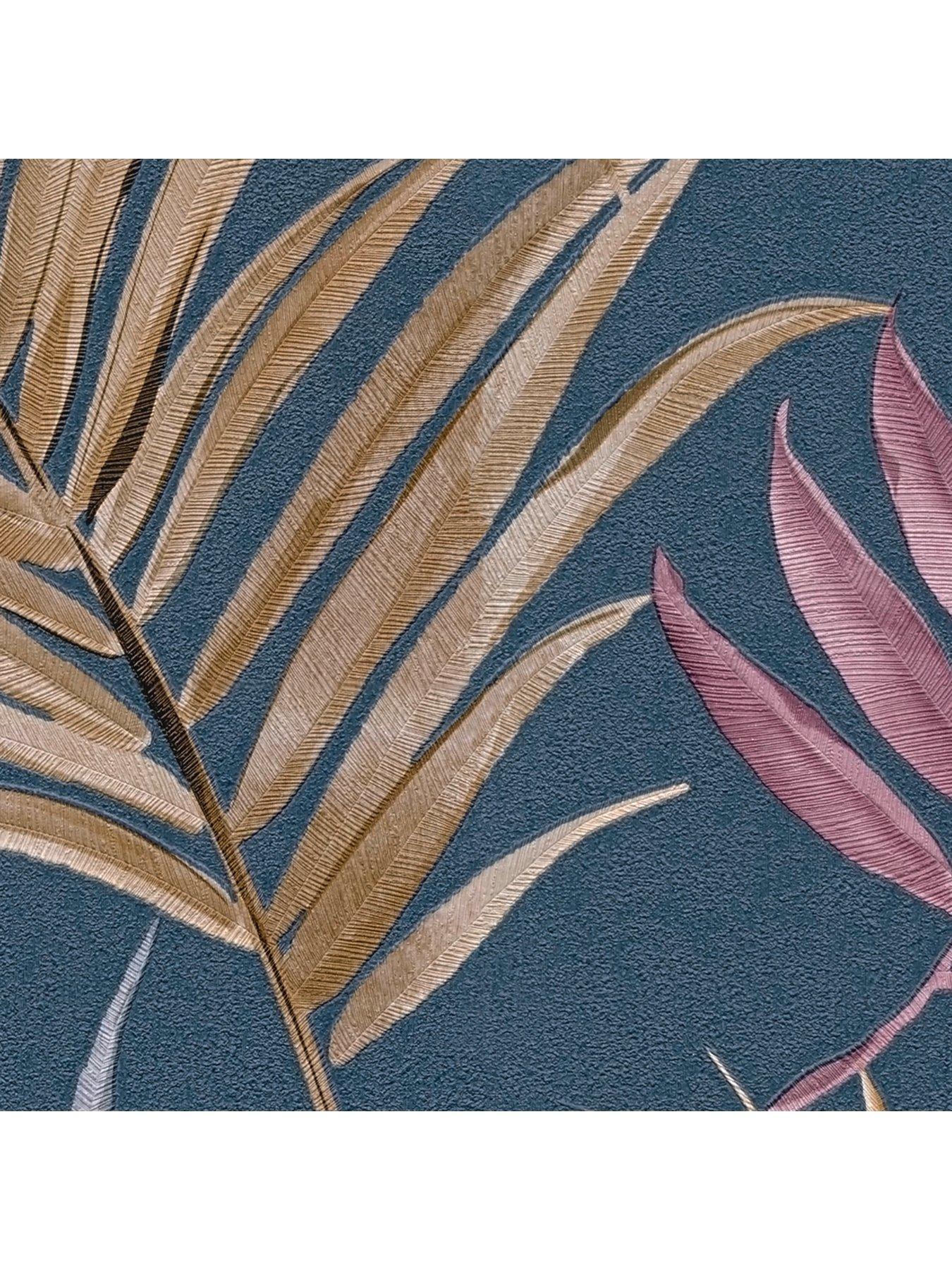 CosmoLiving by Cosmopolitan Midnight Botanica Beige Blue Lilac Non Woven WallpaperBe bold with this tropical, and sophisticated design, perfect for making a statement. Featuring vivid palm and botanical leaves in rich magenta, mustard gold, copper, and silver-blue tones, set against a deep navy blue background, creating a luxurious and dramatic look for your walls and interior design.