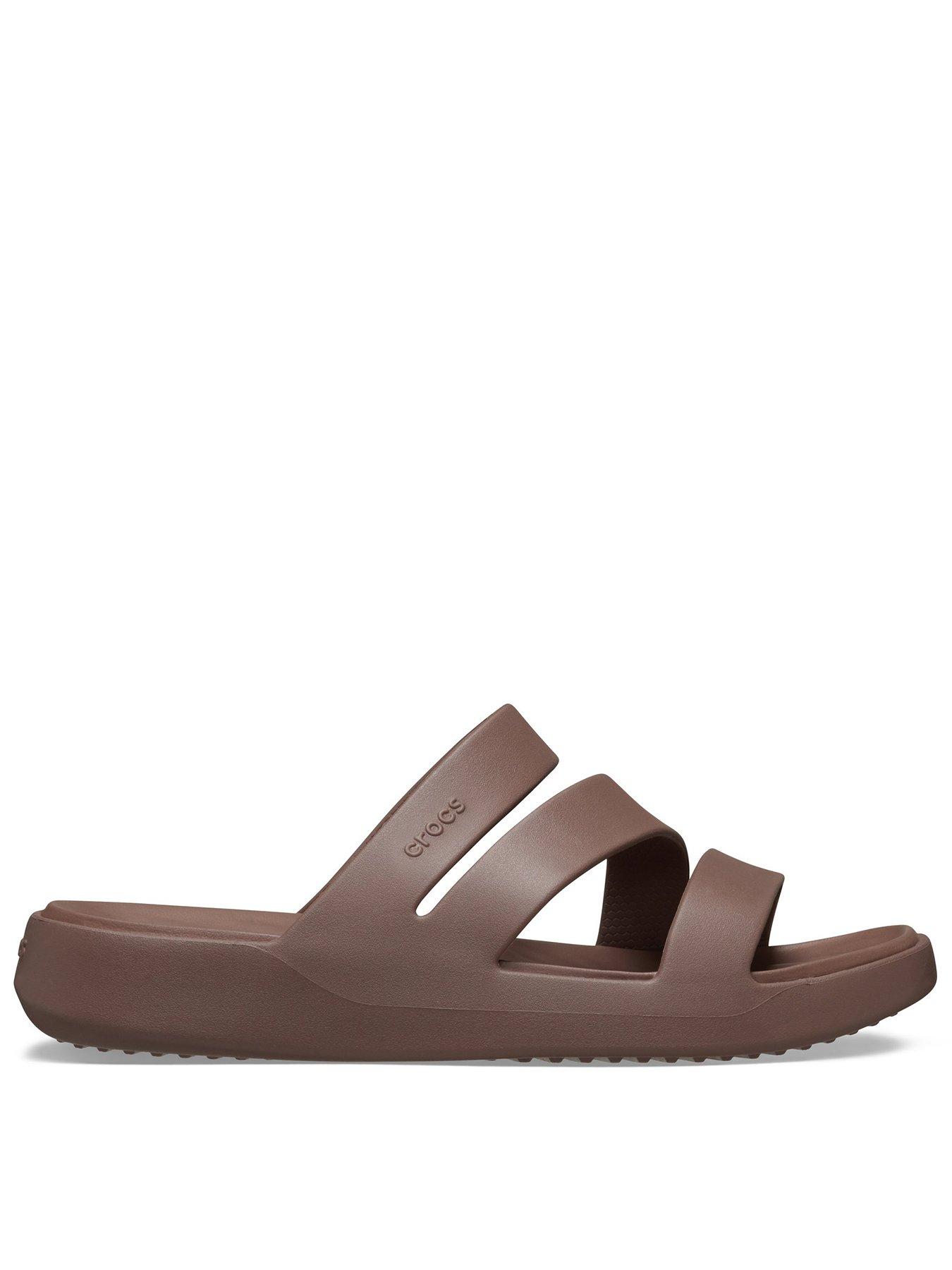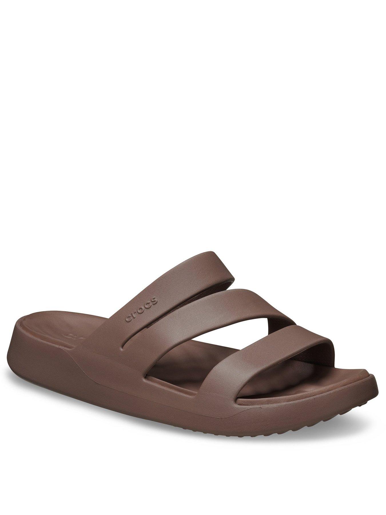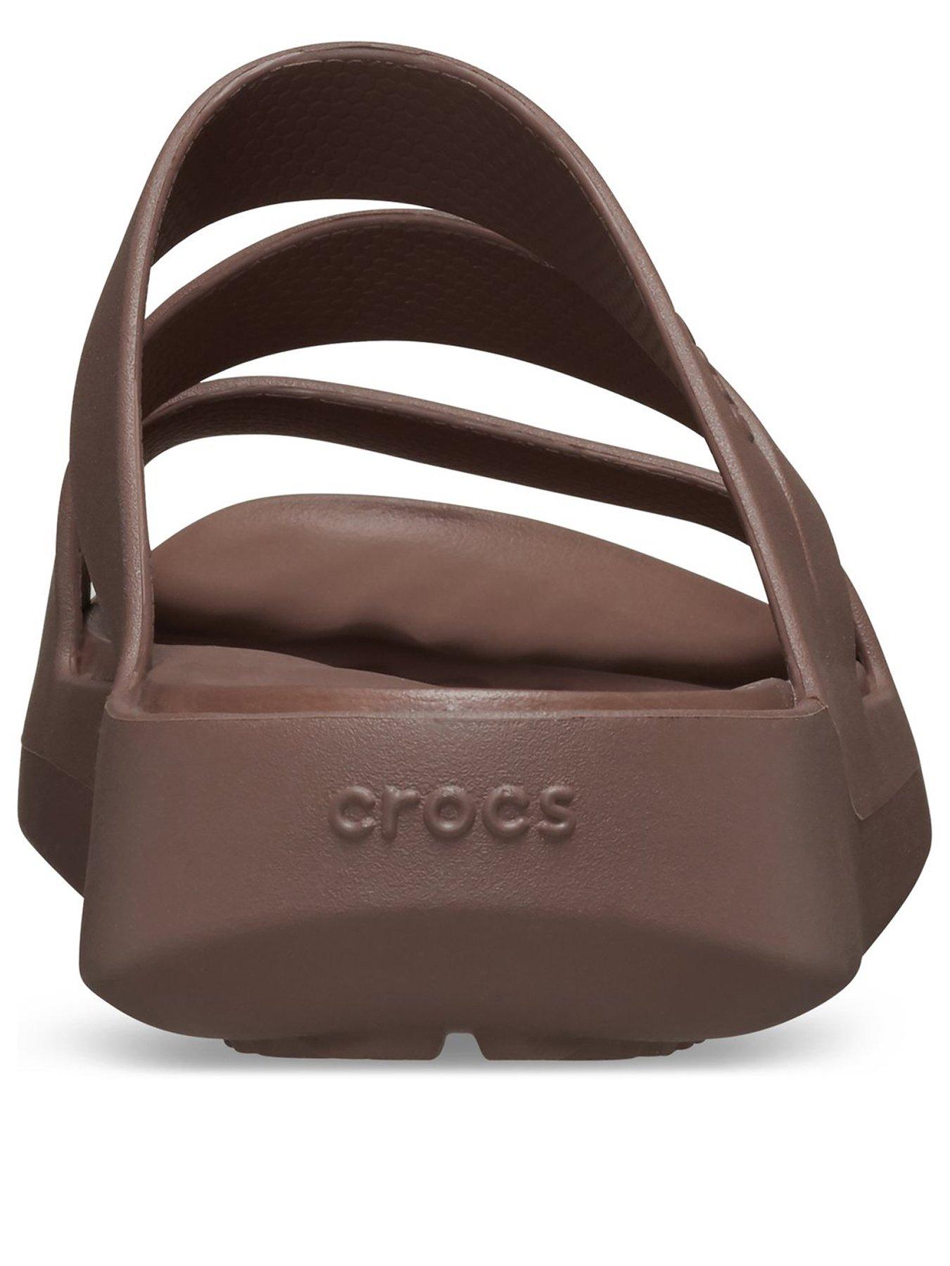Crocs Getaway Strappy Sandal - BrownThe Crocs Getaway Collection with new Free Feel Technology introduces our most seamless comfort innovation yet. The soft, flexible Free Feel Technology upper feels like nothing at all, floating on top of your foot and moving with you without restriction. With a variety of heights and stylish silhouettes, you will have a sandal for every occasion and all your getaways! Once you step in, you will never want to take them off.