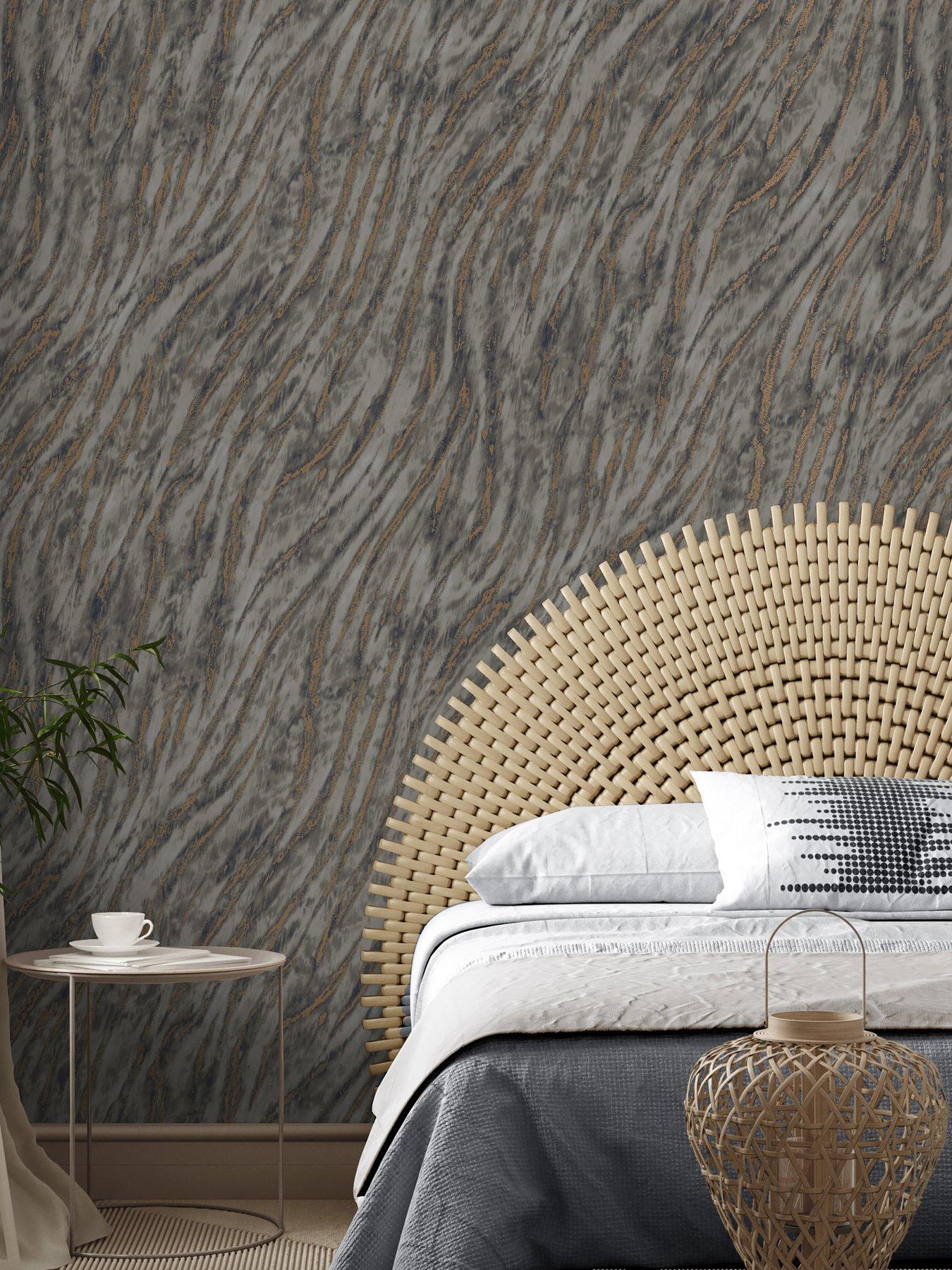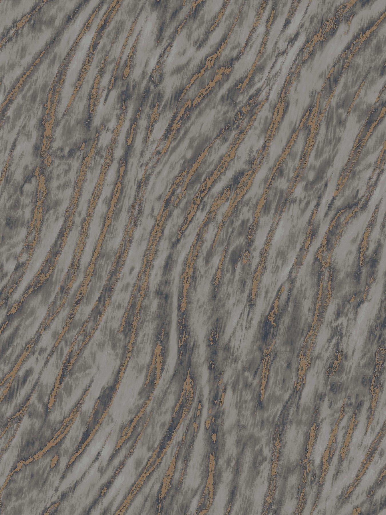 Crown Ember Wallpaper - SmokeOrganic striping is skewed at a diagonal, giving this organic pattern a modern sense of flow. Seen here in shades of grey and steel blue accented by subtle touches of metallic bronze. Arran is an unpasted, vinyl on non woven wallpaper measuring 53cm wide by 10 metres long, covering approximately 57.5 square feet per roll. Unpasted vinyl non woven material; 53cm repeat, drop match. Scrubbable and strippable. 53cm by 10m long roll. Covers about 57.5 square feet