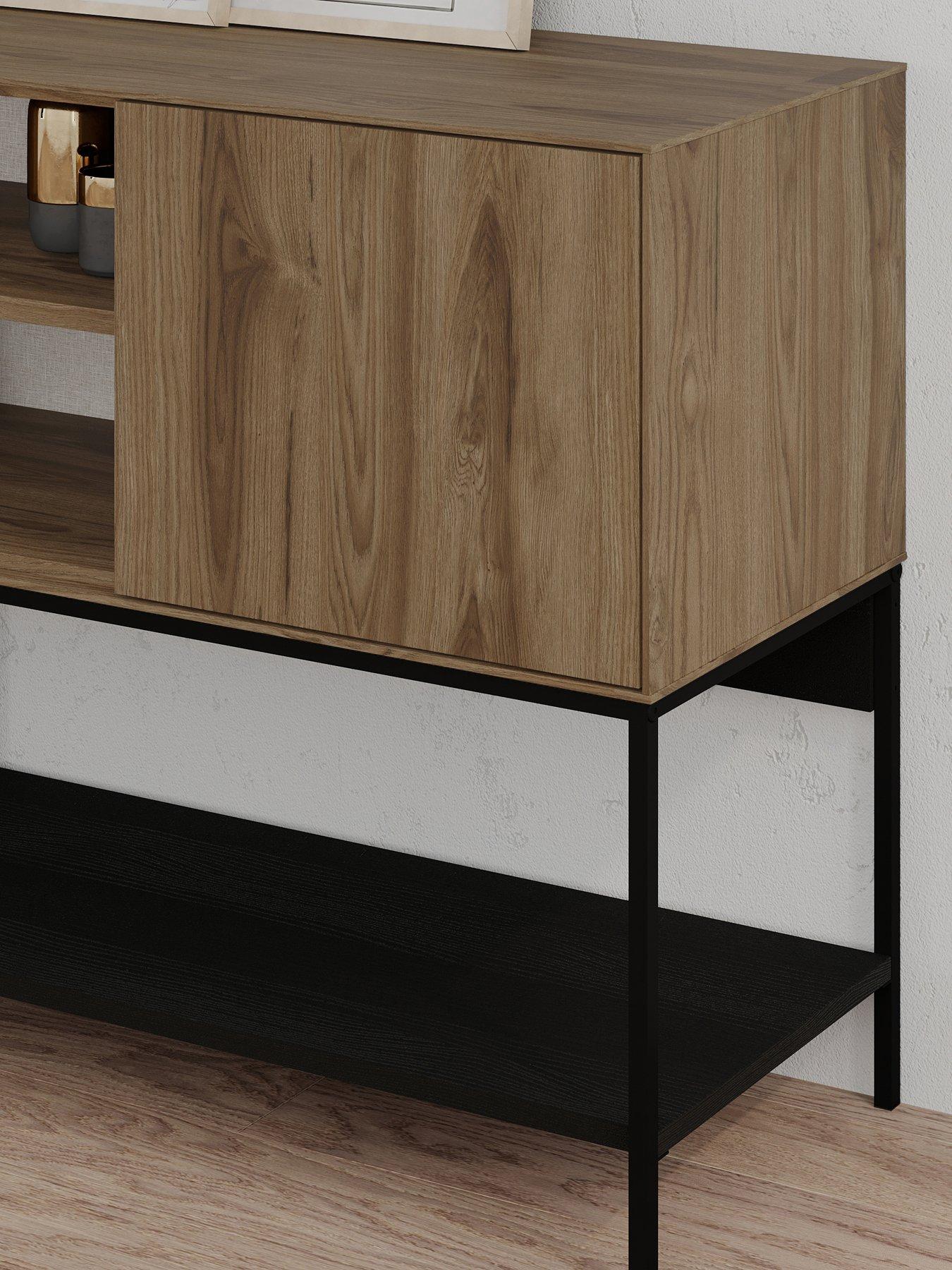 Decortie Cherry Large Sideboard - Oud/blackUpgrade your home with the Cherry Large Sideboard, a perfect blend of contemporary design and functional storage. Measuring an impressive 180cm in width, this versatile sideboard is ideal for your living room, dining area, or hallway. Stylish Design: Finished in an elegant natural oud colour with a sturdy black metal frame, this sideboard is a standout piece that complements modern interiors. Ample Storage: Features two spacious cupboards for hidden storage, central open shelves for display, and a full-length bottom shelf for added organisation. Multi-Purpose Use: Perfect as a dining room buffet, living room cabinet, or hallway storage unit, offering both style and practicality. Durable: Crafted from high-quality engineered wood, this sideboard is built to last. Easy Assembly: Comes with clear instructions for a hassle-free setup.